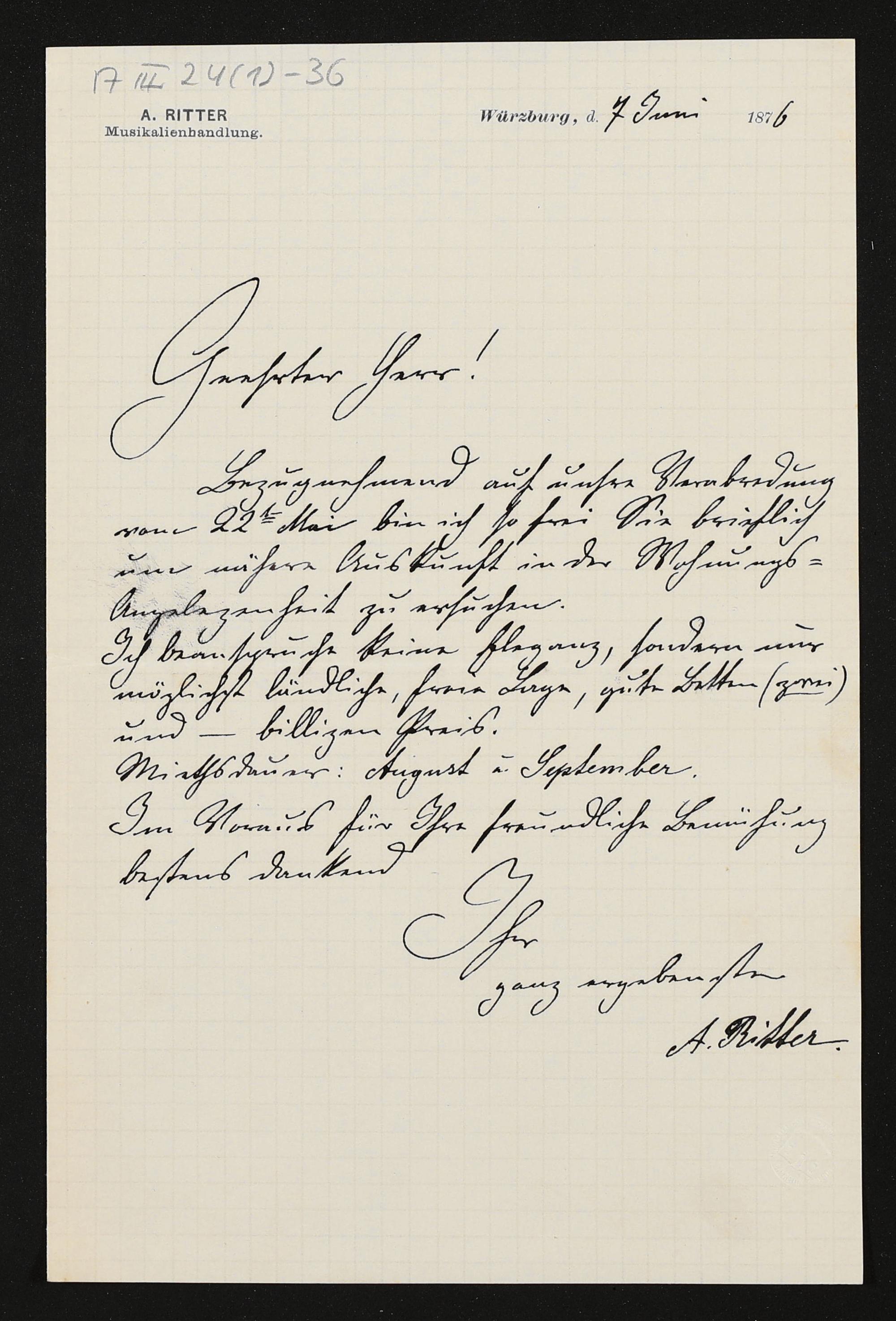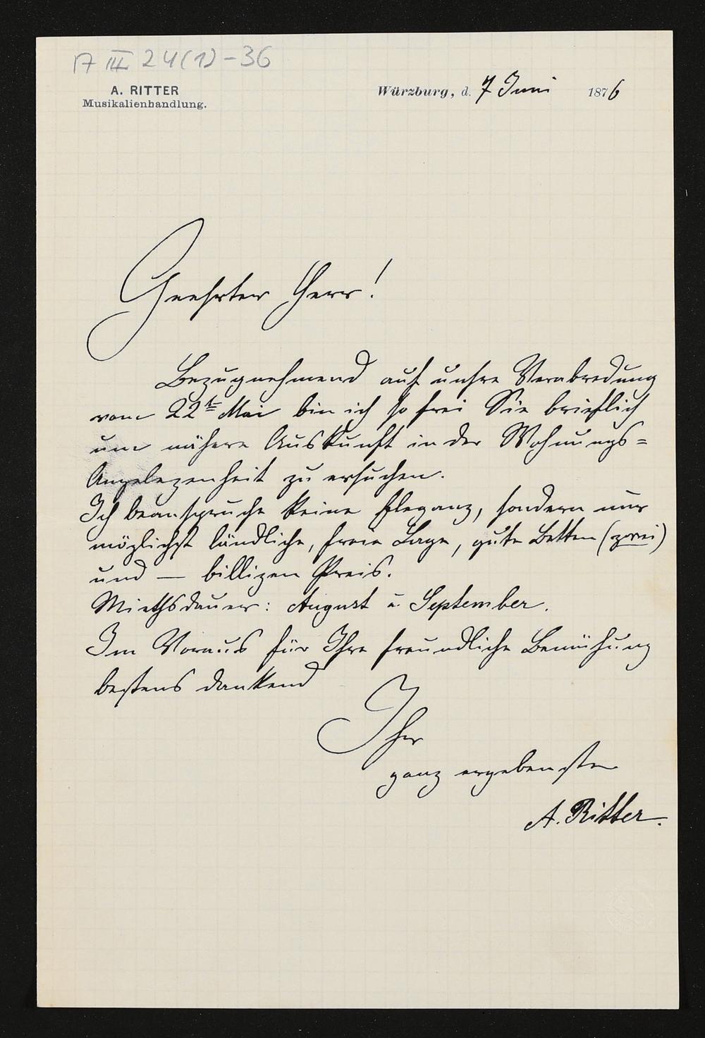 eigenhändiger Brief von Alexander Ritter an einen unbekannten Empfänger
