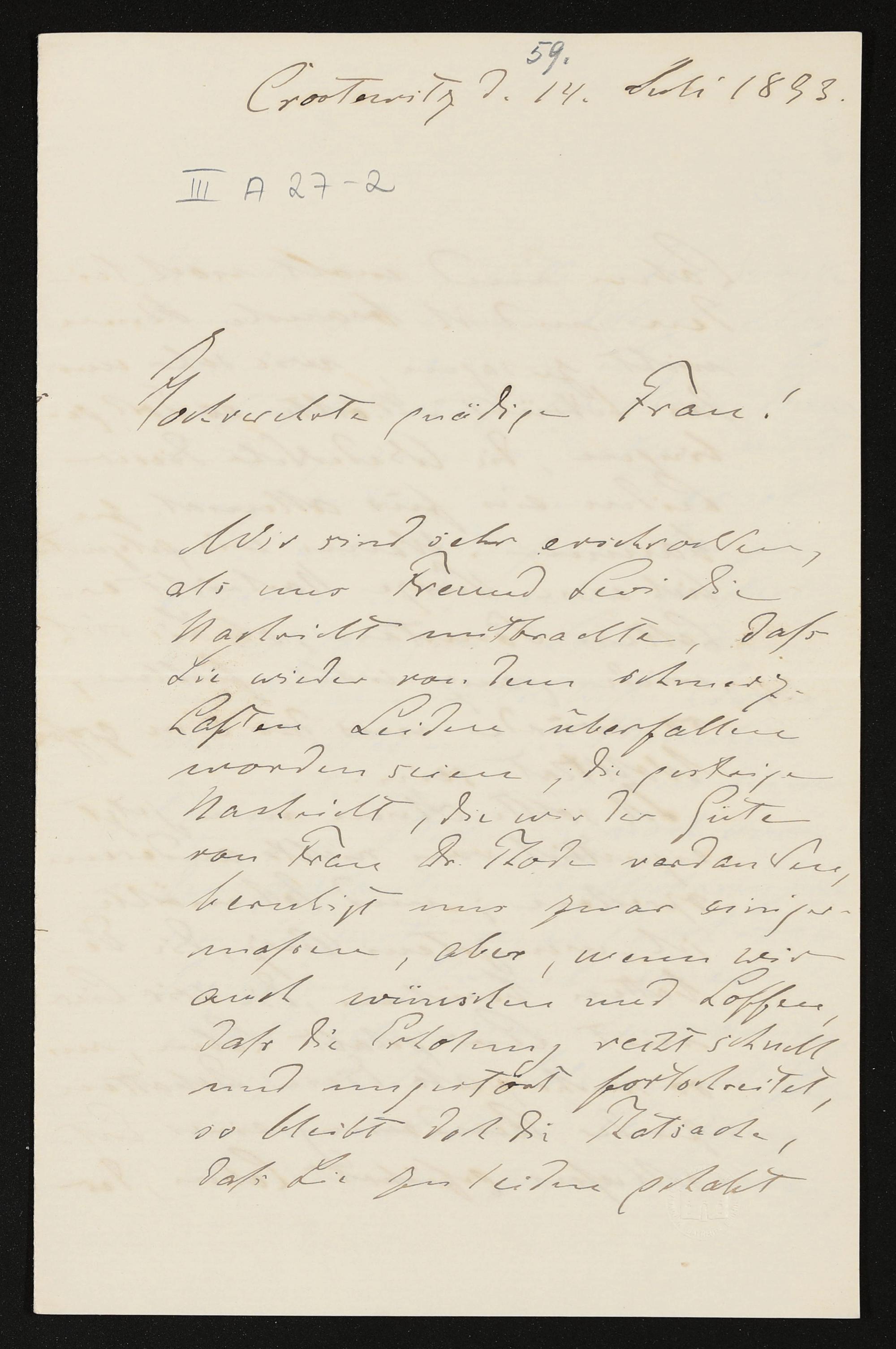 eigenhändiger Brief von Conrad Fiedler an Cosima Wagner
