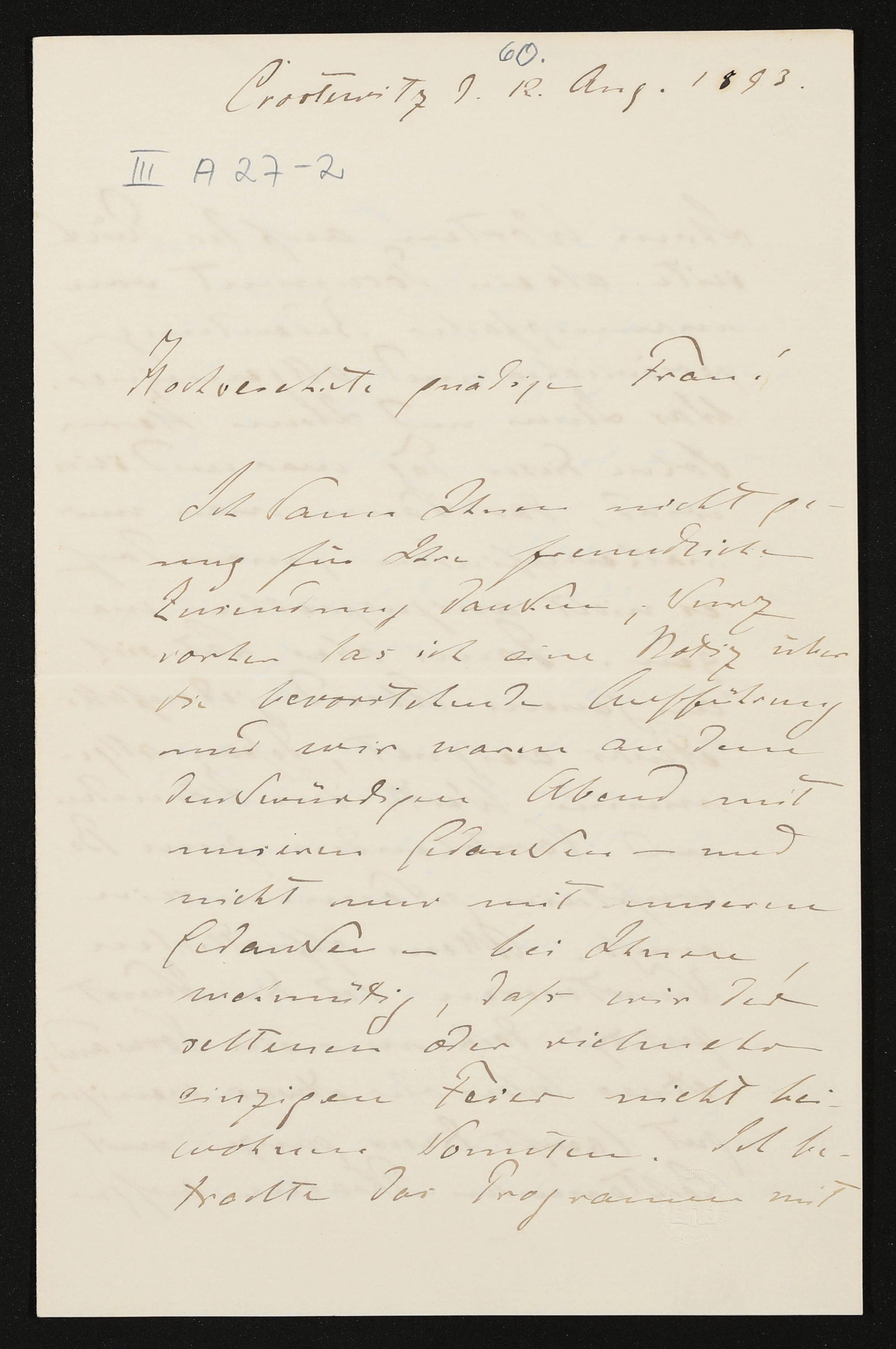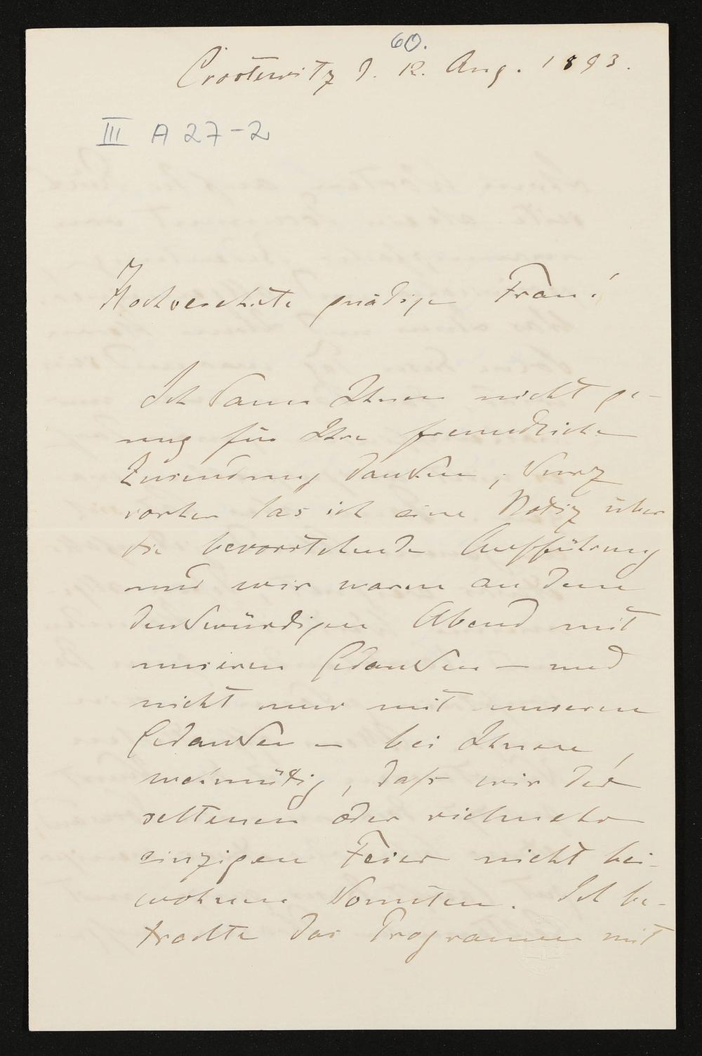 eigenhändiger Brief von Conrad Fiedler an Cosima Wagner