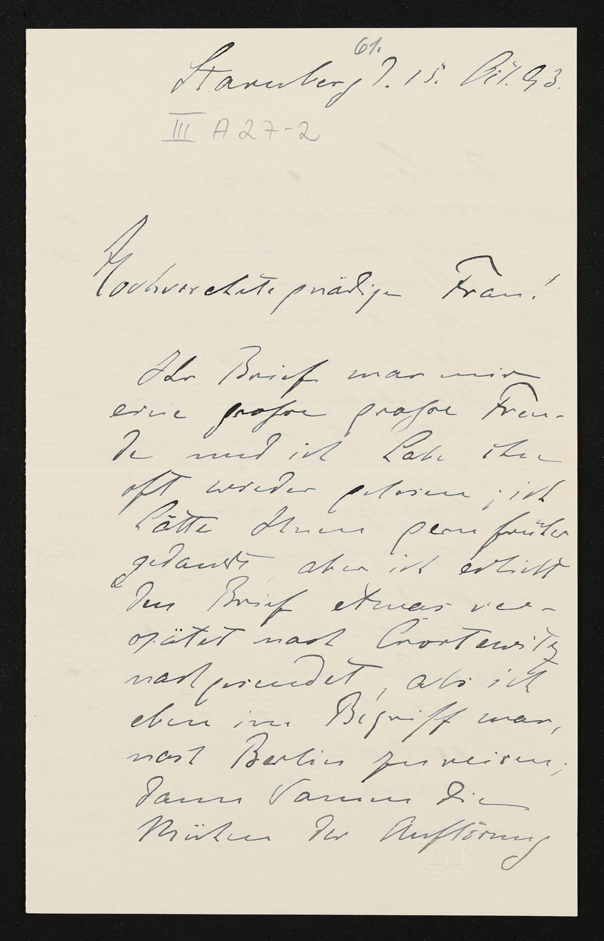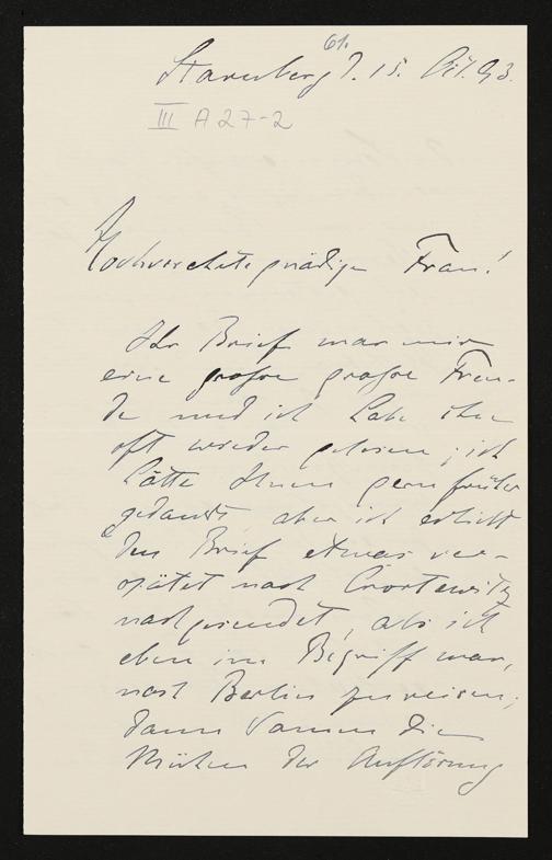 eigenhändiger Brief von Conrad Fiedler an Cosima Wagner