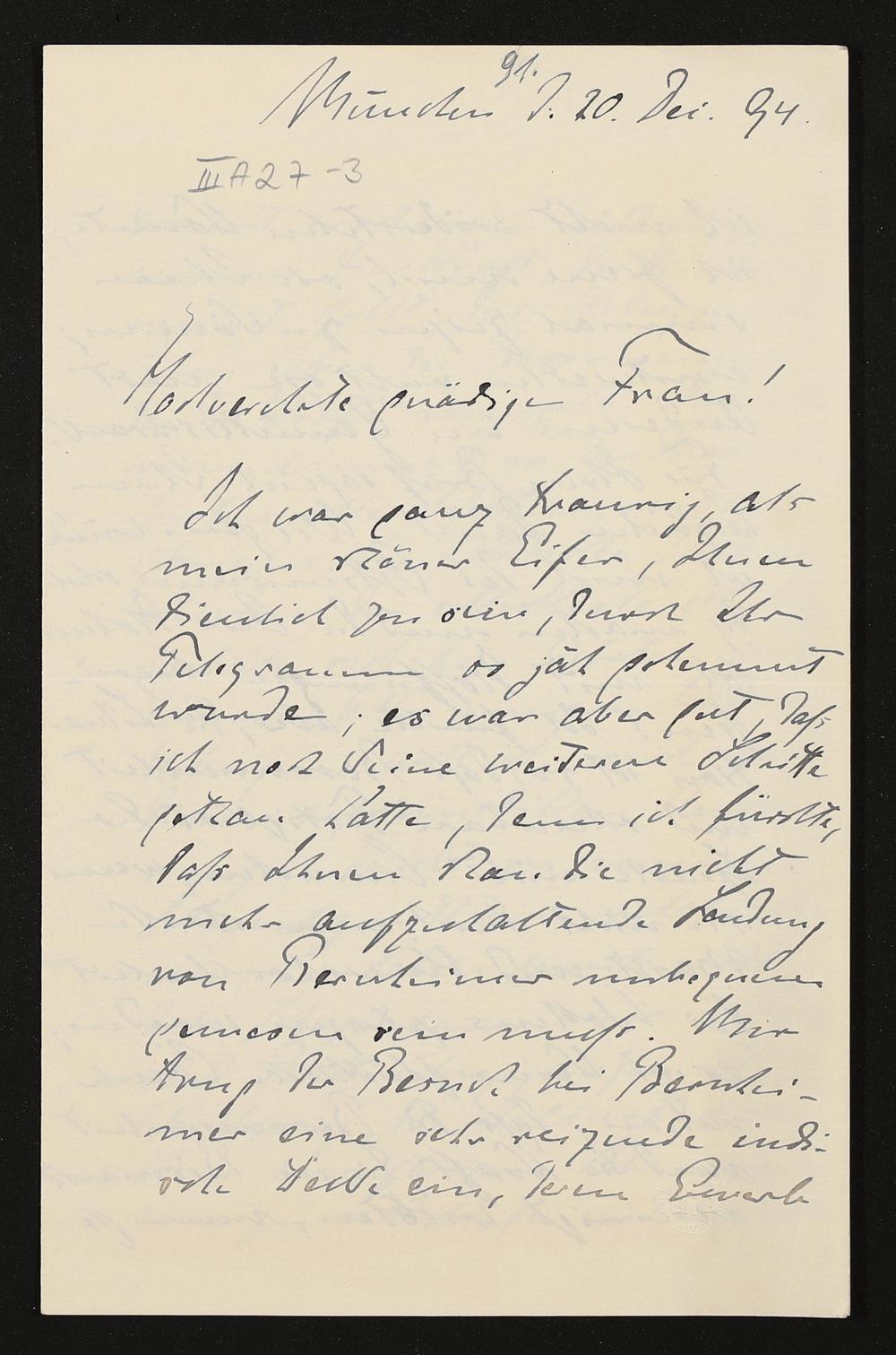 eigenhändiger Brief von Conrad Fiedler an Cosima Wagner