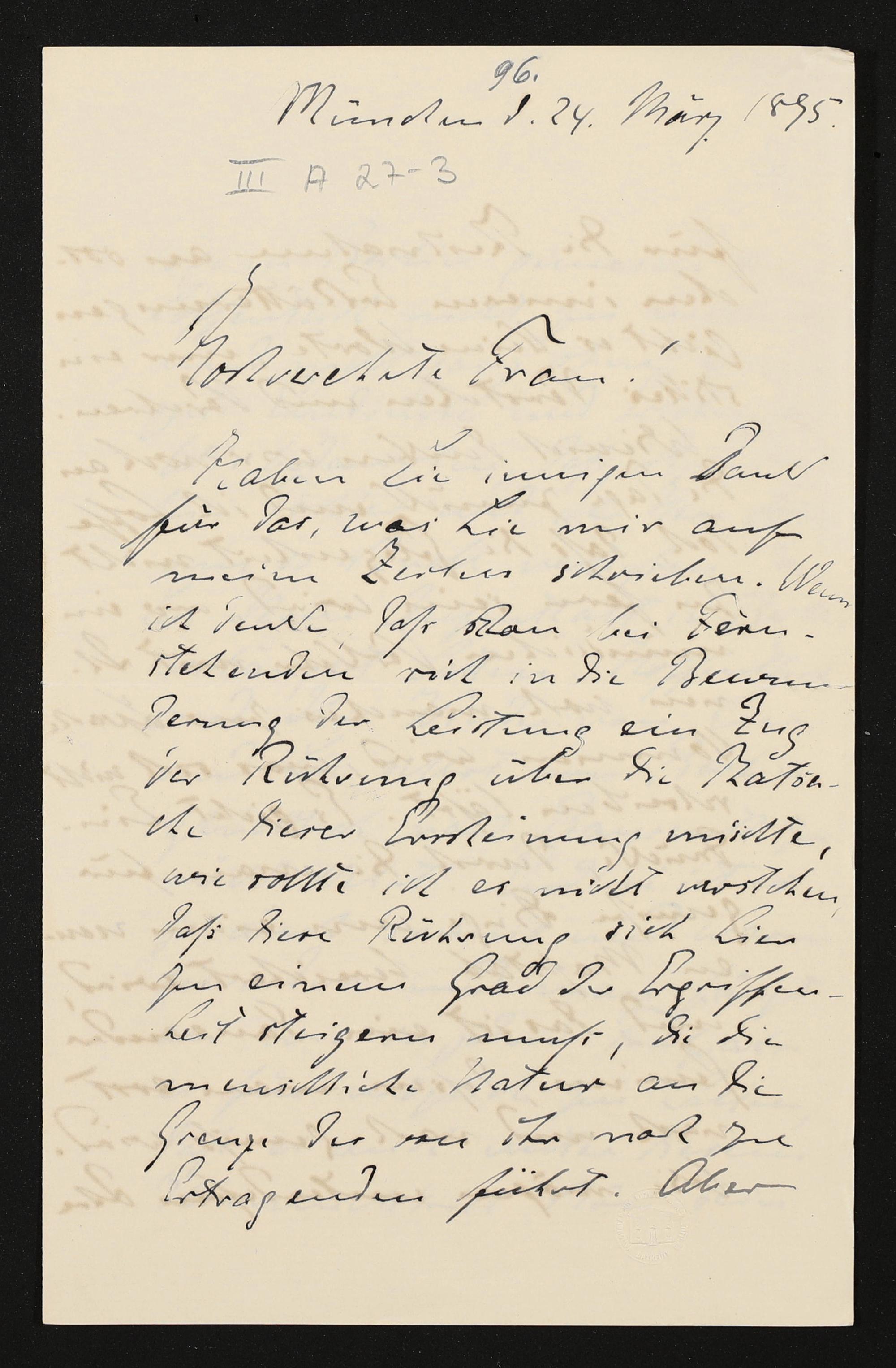 eigenhändiger Brief von Conrad Fiedler an Cosima Wagner