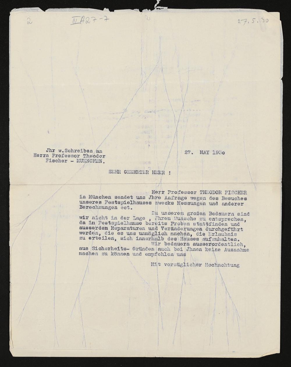 maschinenschriftlicher Brief vom Verwaltungsrat der Bühnenfestspiele an Theodor Fischer