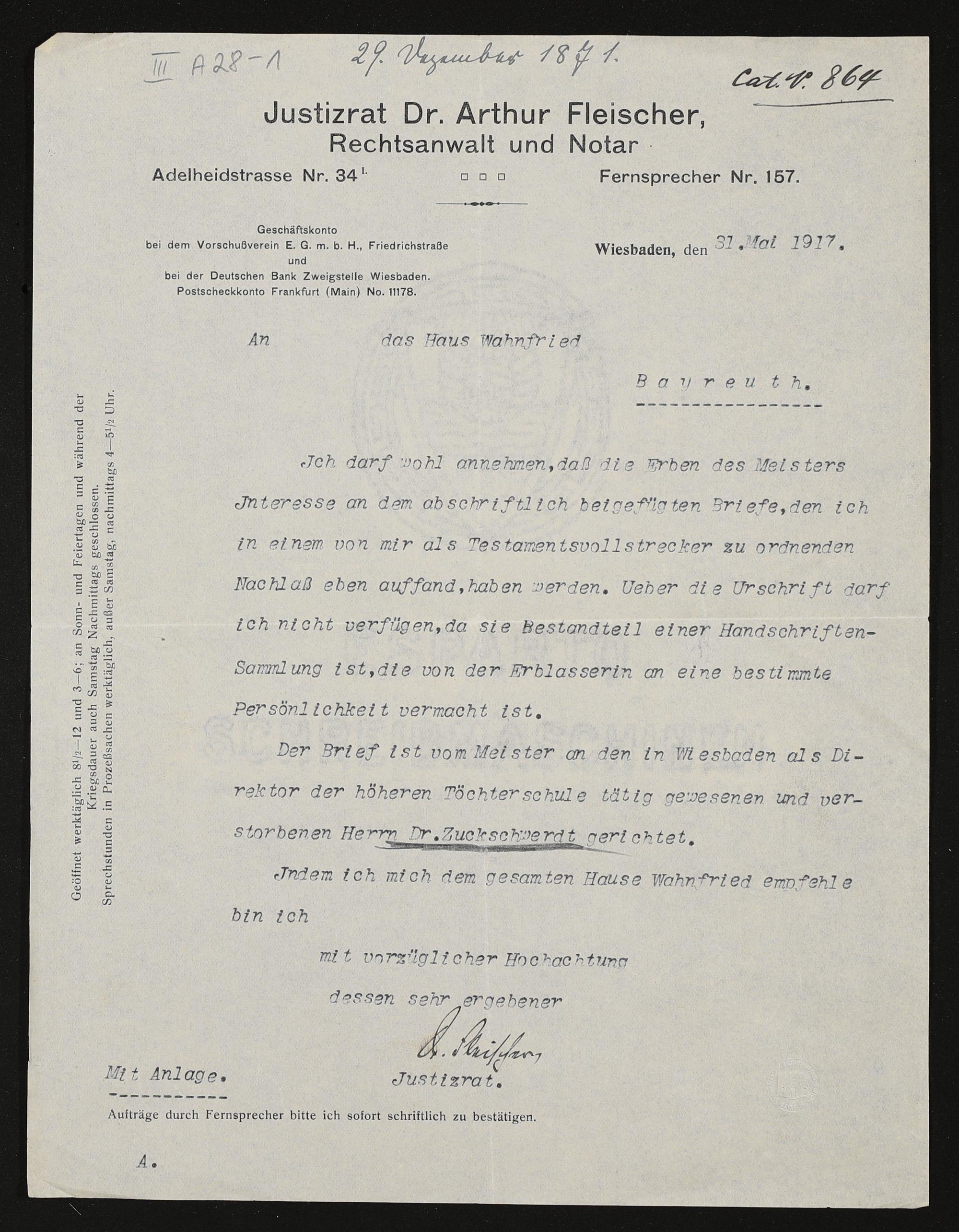 maschinenschriftlicher Brief von Arthur Fleischer an Haus Wahnfried