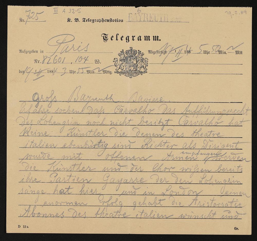 Telegramm von Judith Gautier an Adolf von Gross