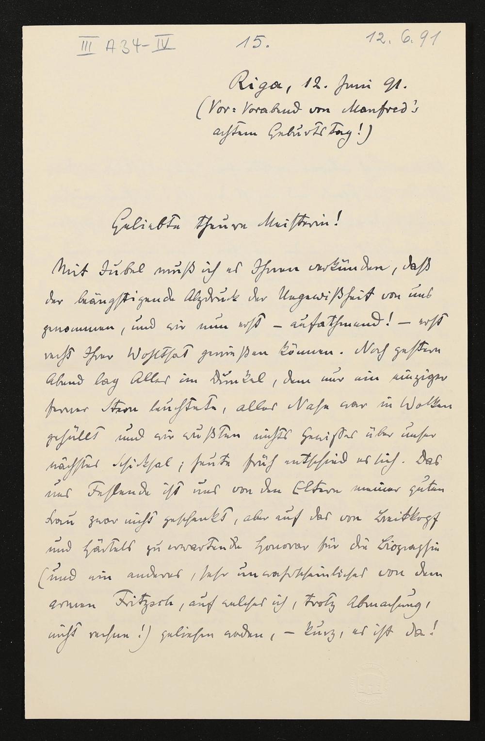 eigenhändiger Brief von Carl Friedrich Glasenapp an Cosima Wagner