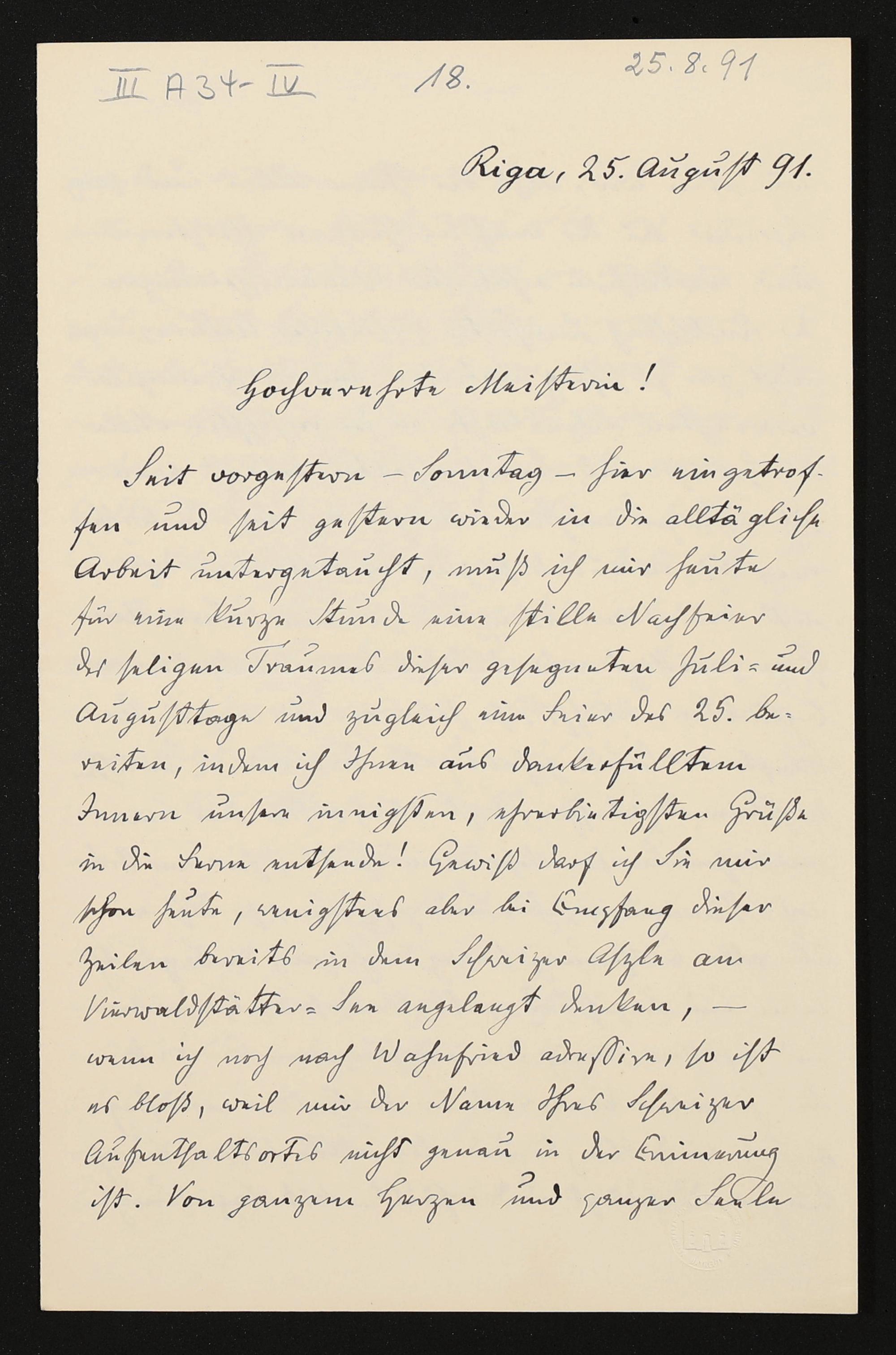 eigenhändiger Brief von Carl Friedrich Glasenapp an Cosima Wagner