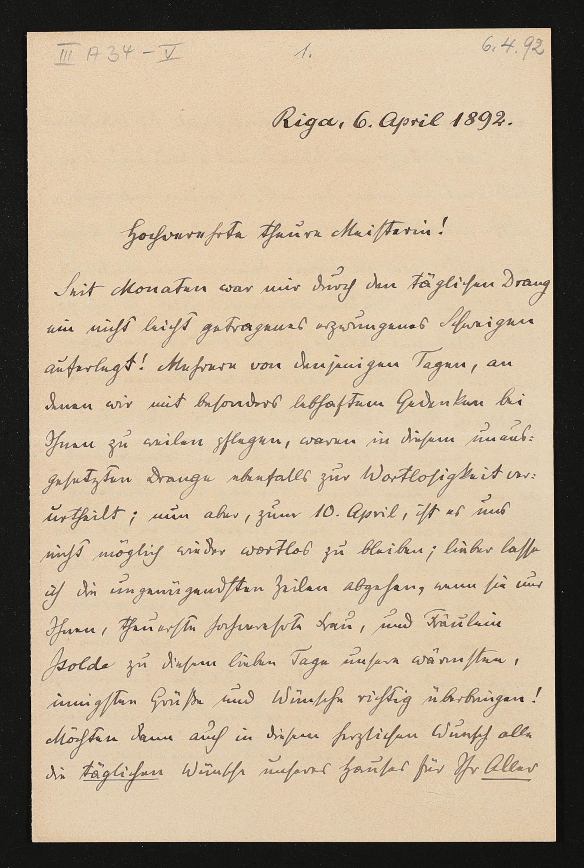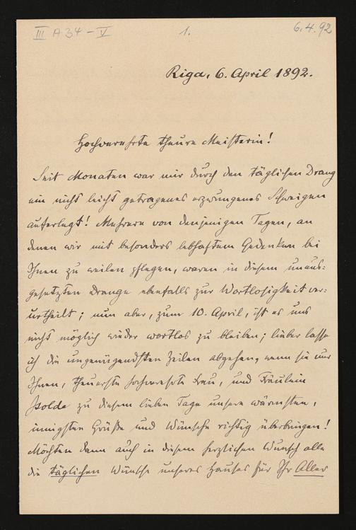 eigenhändiger Brief von Carl Friedrich Glasenapp an Cosima Wagner
