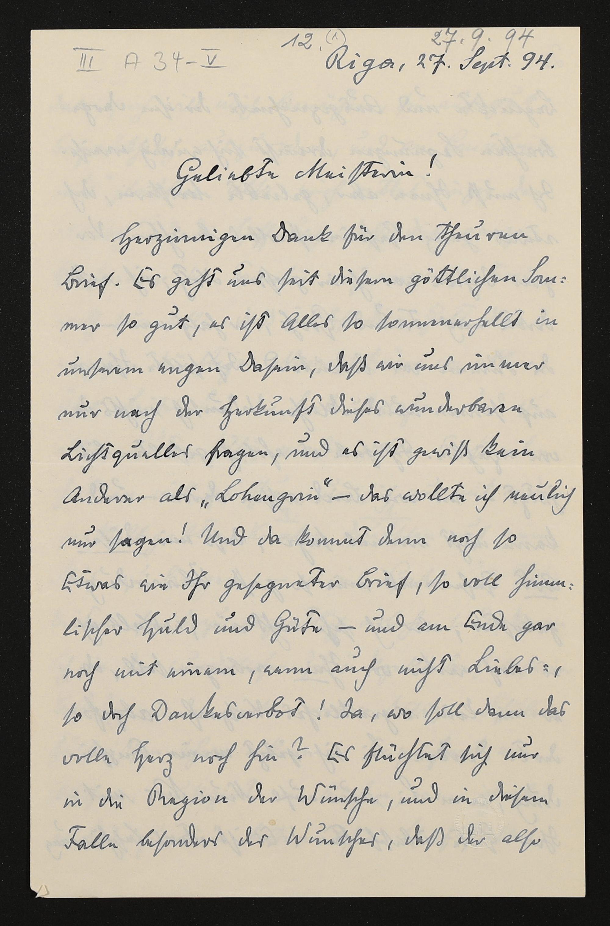 eigenhändiger Brief von Carl Friedrich Glasenapp an Cosima Wagner