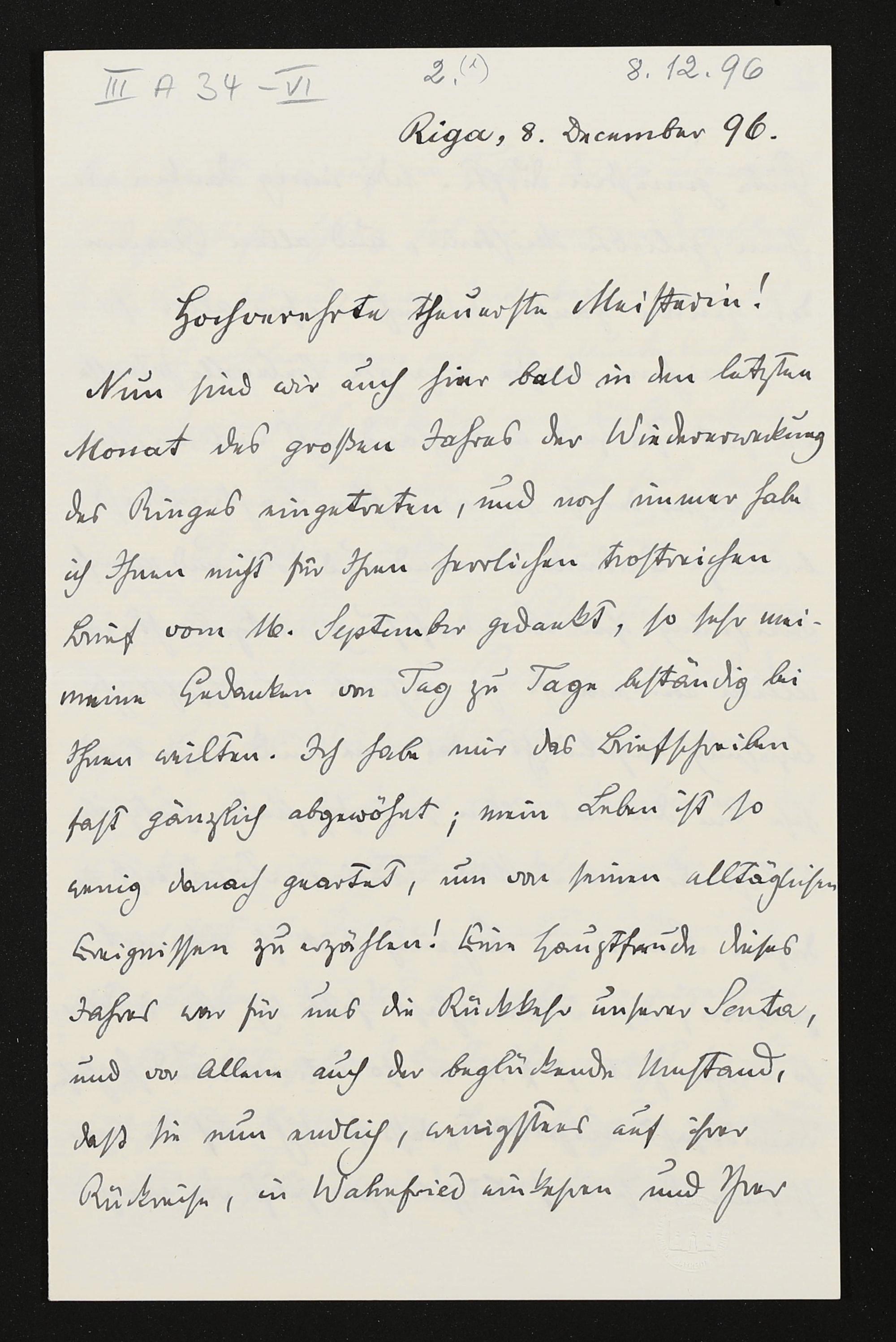 eigenhändiger Brief von Carl Friedrich Glasenapp an Cosima Wagner
