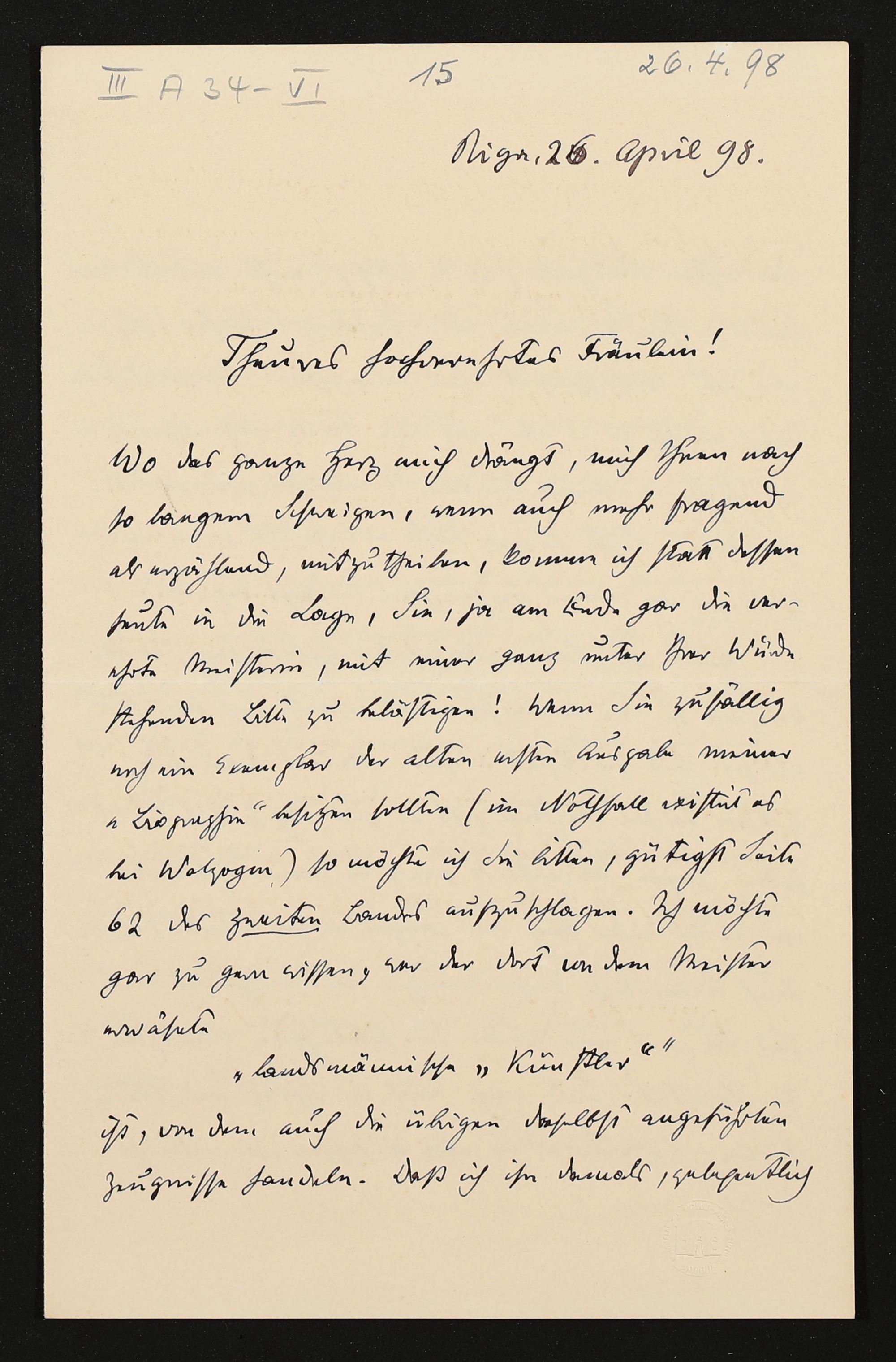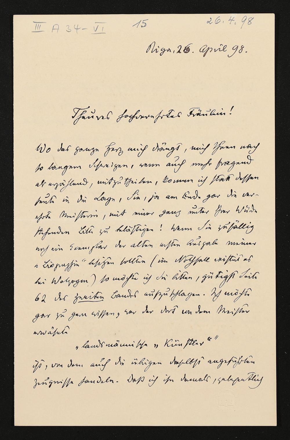 eigenhändiger Brief von Carl Friedrich Glasenapp an Eva Wagner