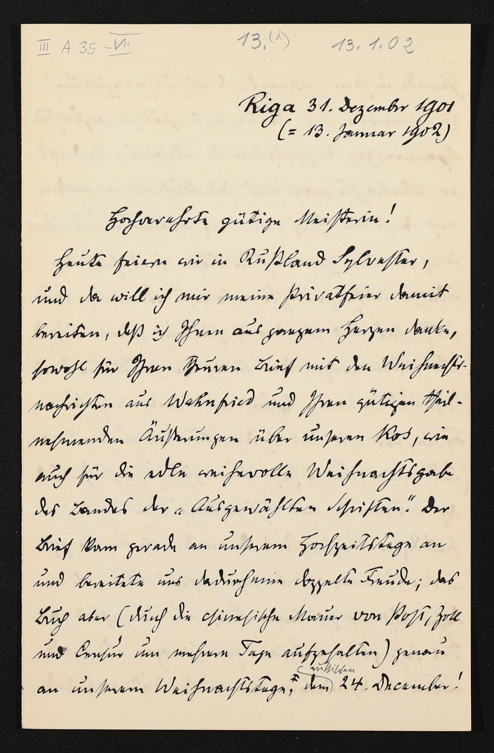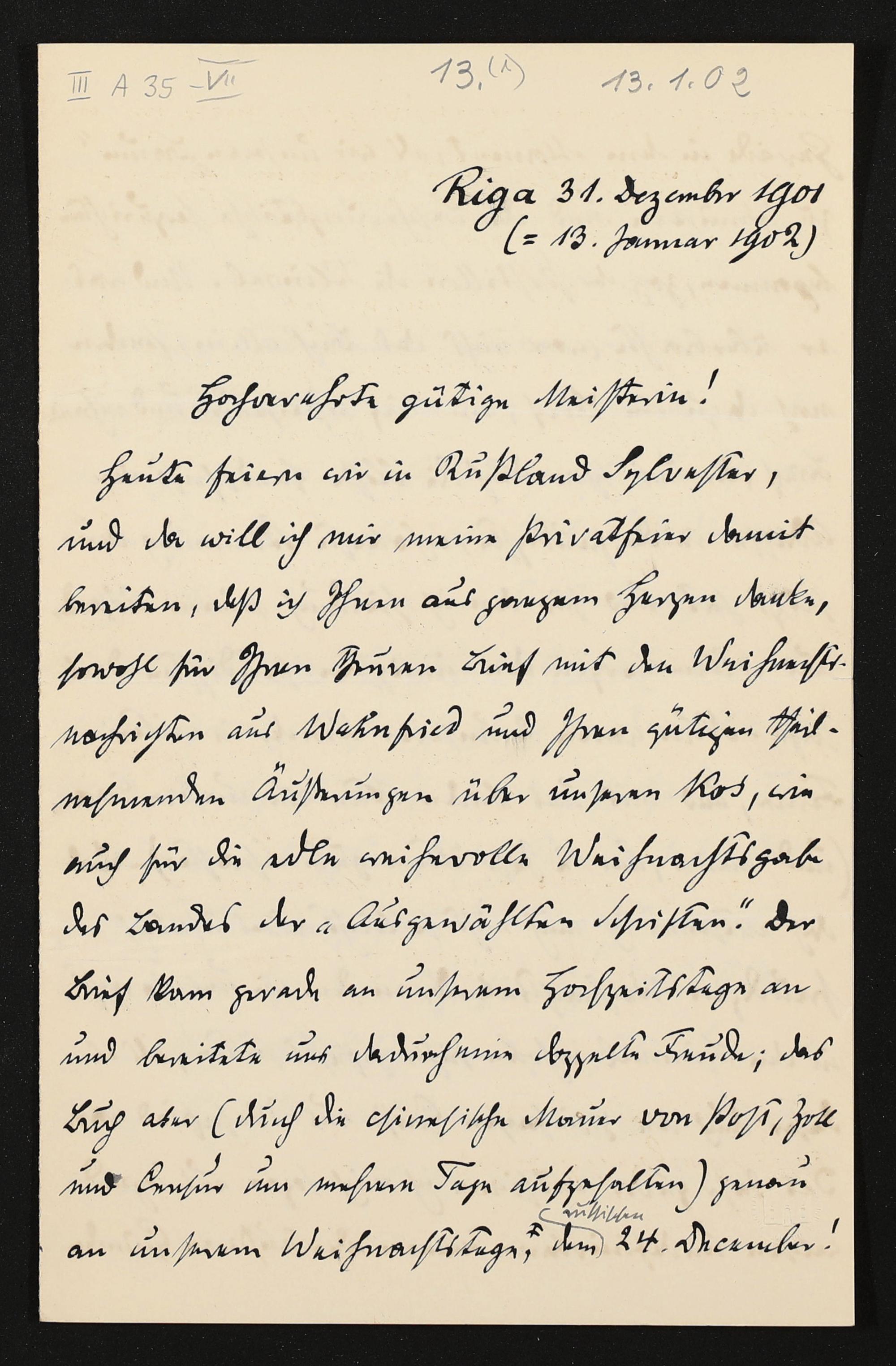 eigenhändiger Brief von Carl Friedrich Glasenapp an Cosima Wagner