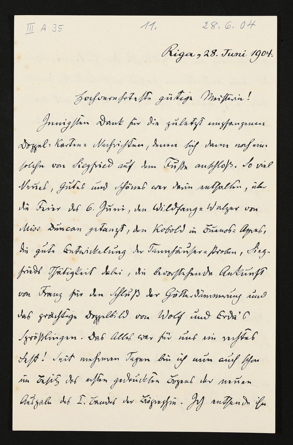 eigenhändiger Brief von Carl Friedrich Glasenapp an Cosima Wagner