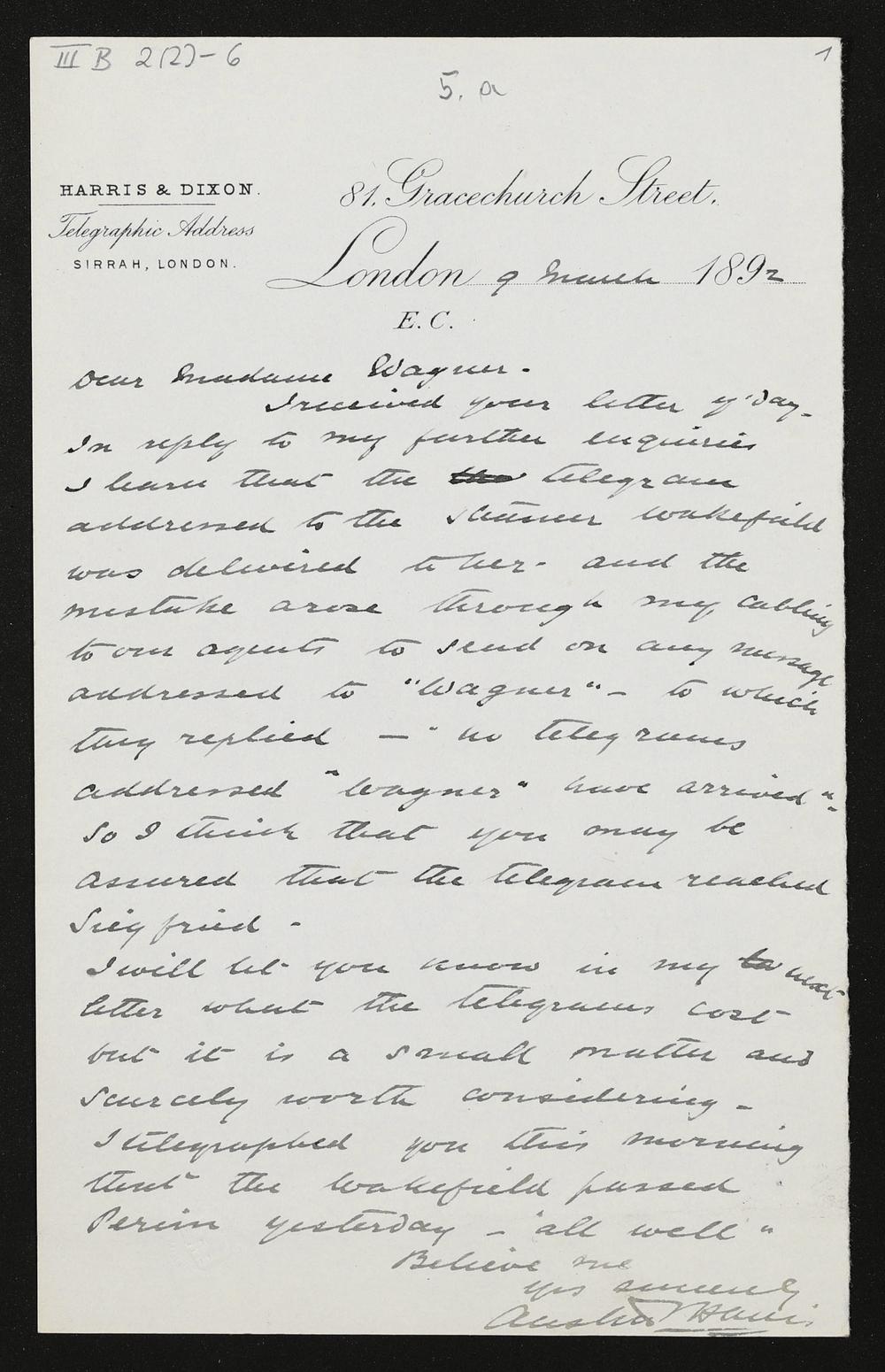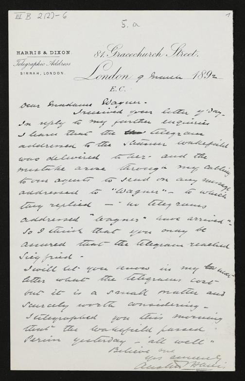 eigenhändiger Brief von Austin Harris an Cosima Wagner