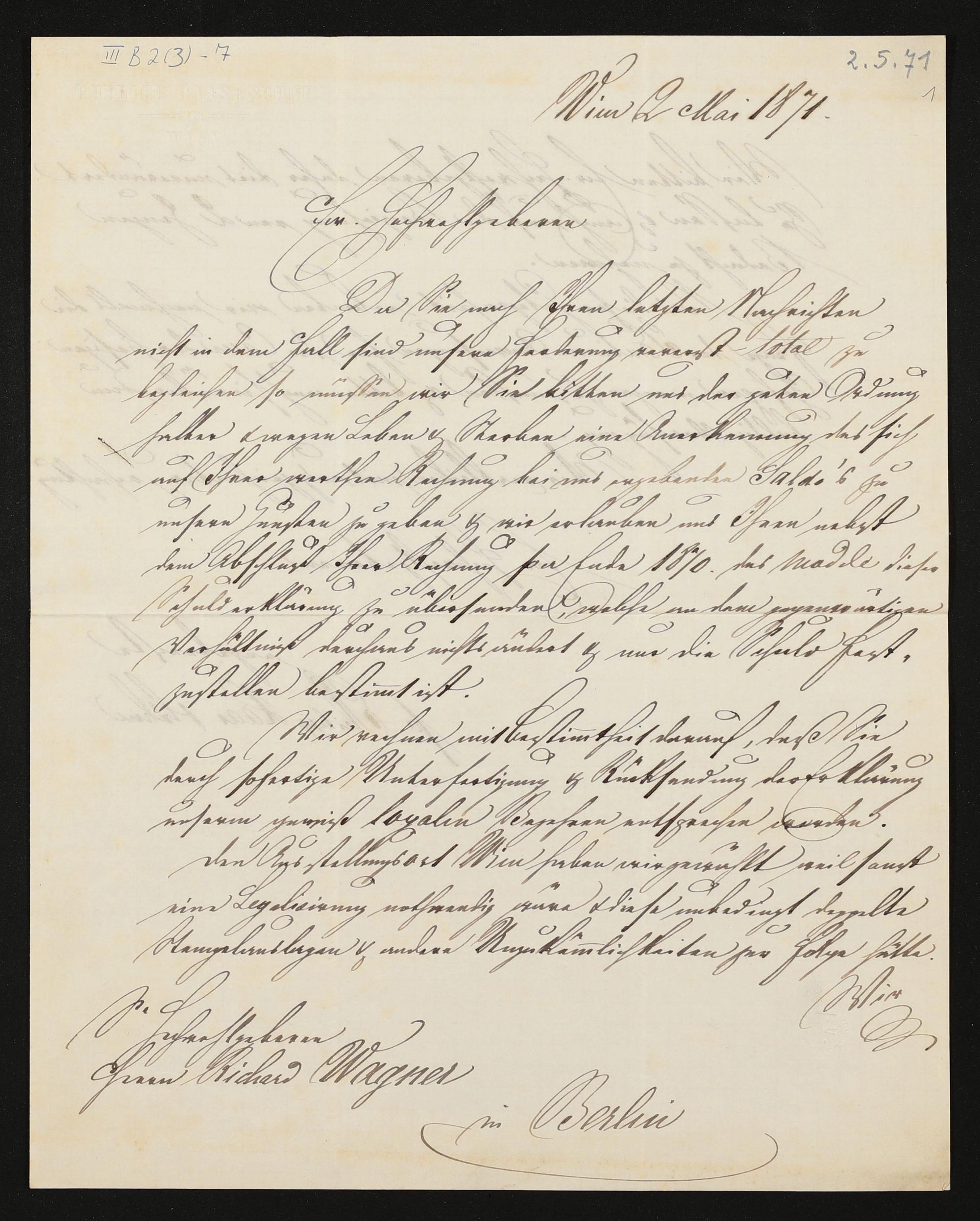 eigenhändiger Brief von Philipp Haas & Söhne an Richard Wagner