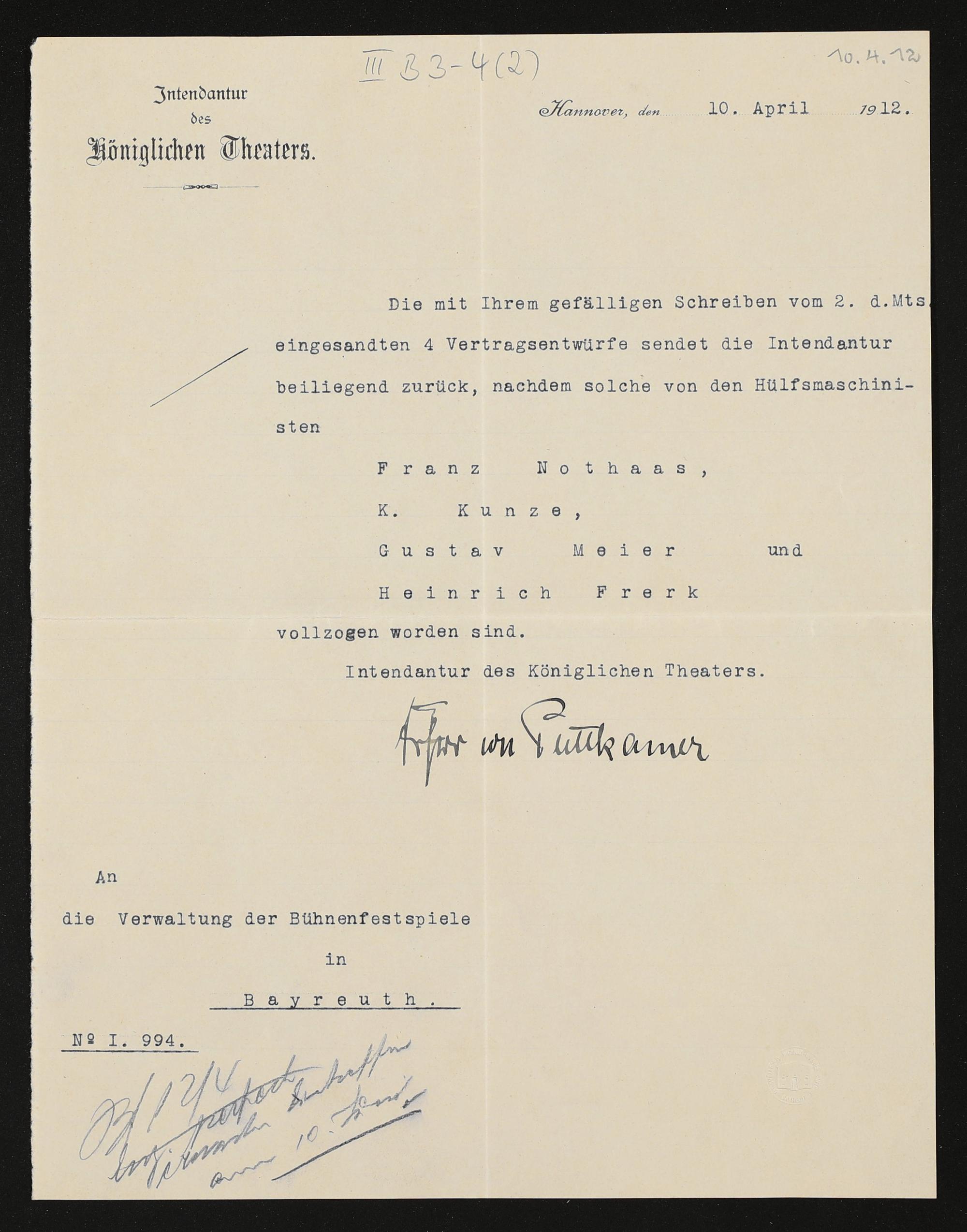 eigenhändiger Brief von der Intendatur des Königlichen Theaters Hannover an den Verwaltungsrat der Bühnenfestspiele Bayreuth