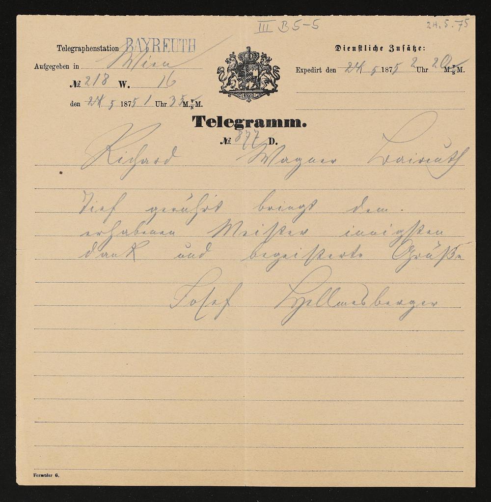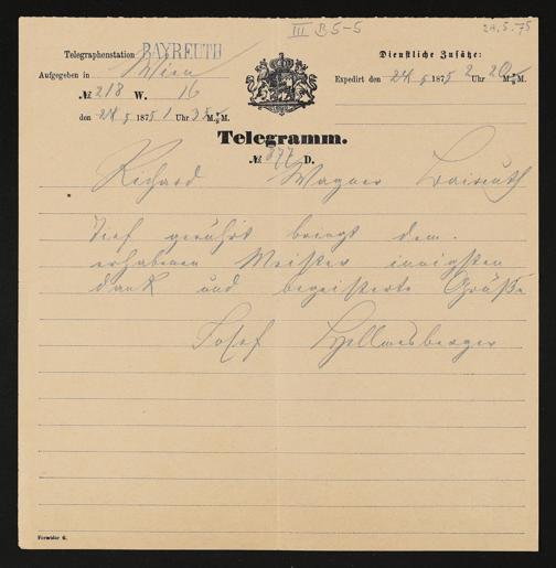 Telegramm von Josef Hellmesberger an Richard Wagner