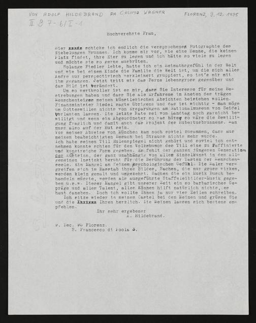 maschinenschriftliche Abschrift eines Briefes von Adolf von Hildebrandt an Cosima Wagner