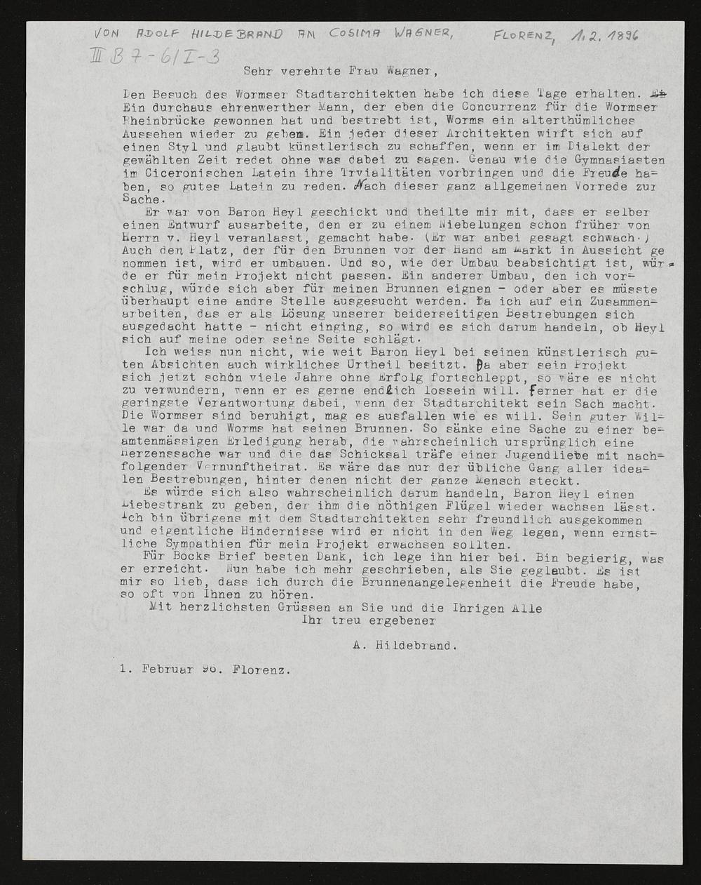 maschinenschriftliche Abschrift eines Briefes von Adolf von Hildebrandt an Cosima Wagner