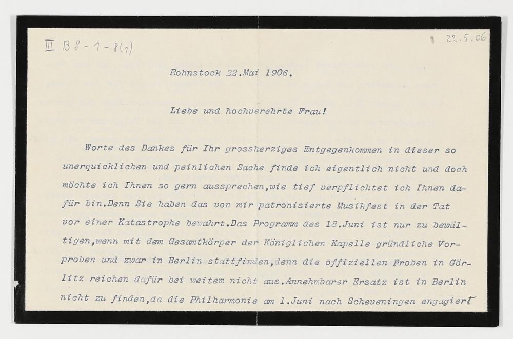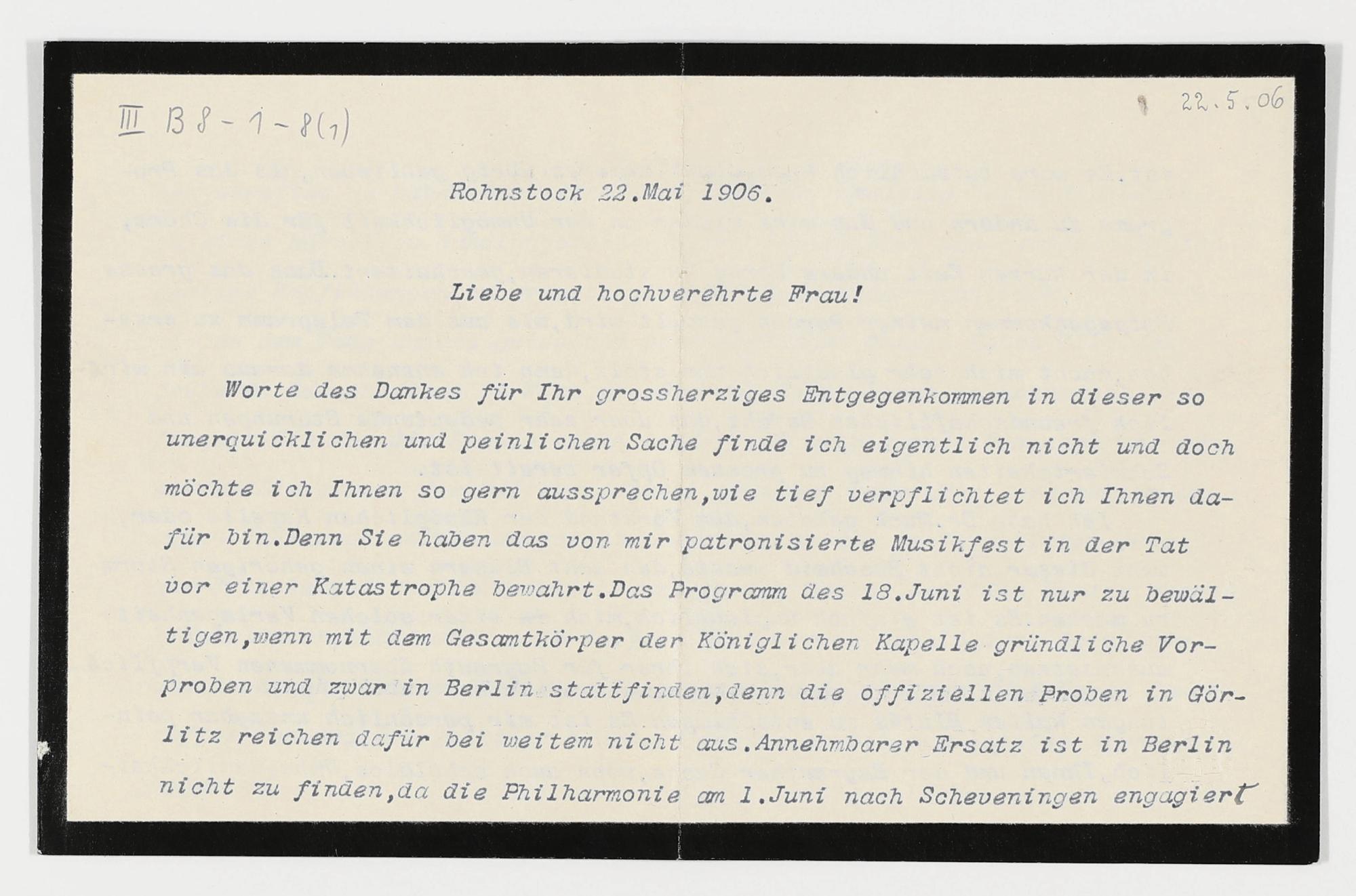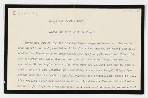 maschinenschriftliche Briefkarte von Bolko von Hochberg an Cosima Wagner