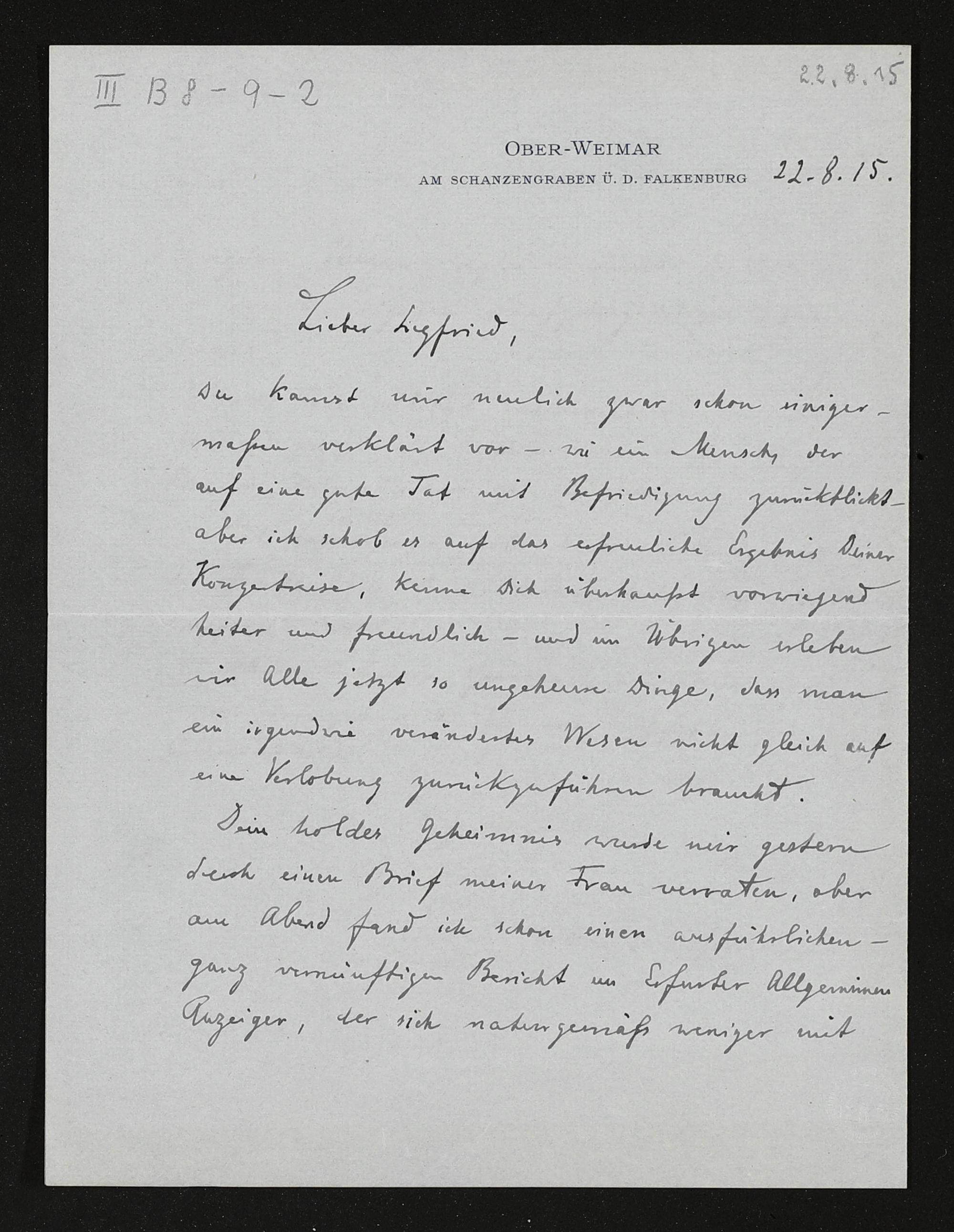 eigenhändiger Brief von Ludwig von Hofmann an Siegfried Wagner