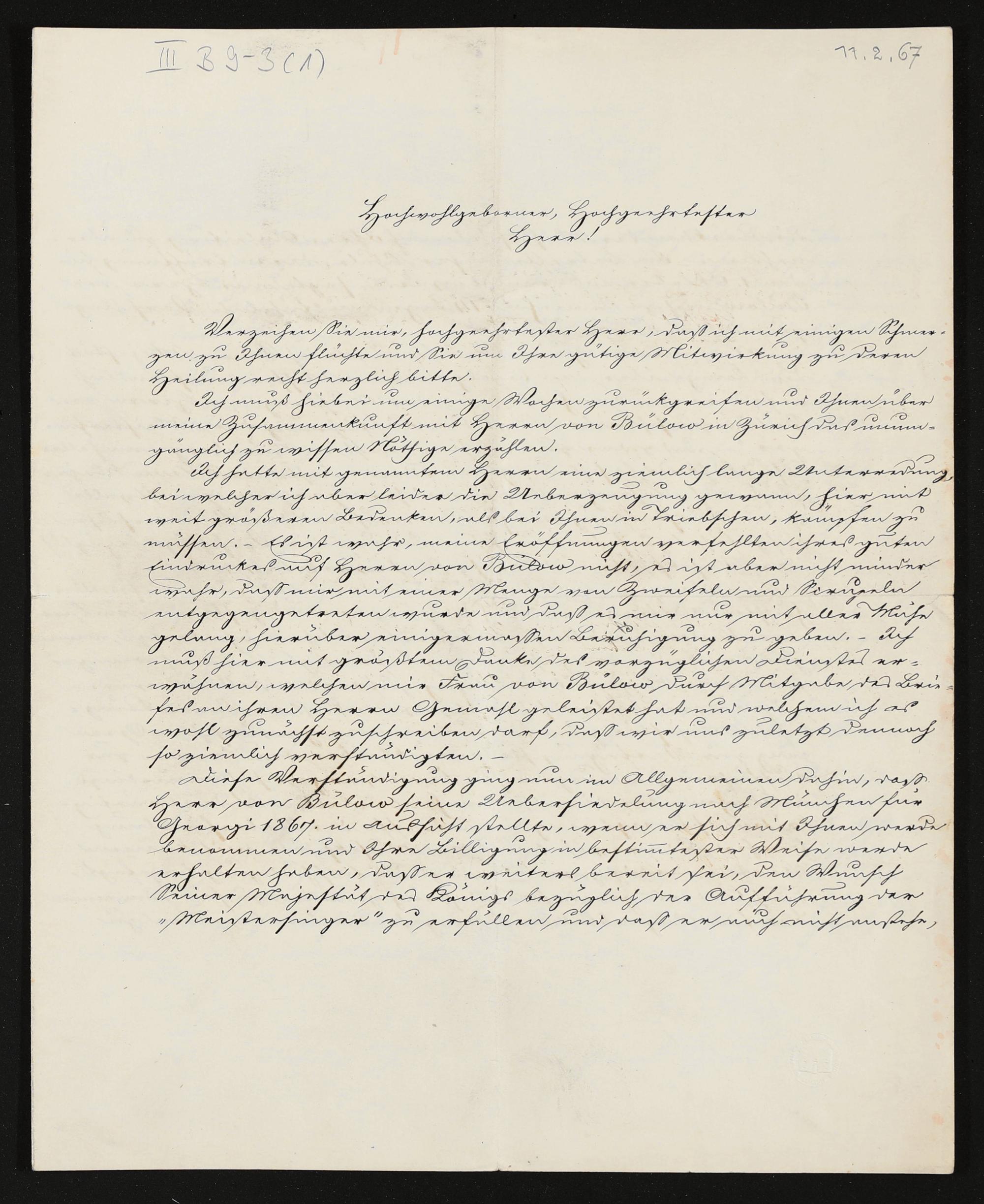 eigenhändiger Brief von Lorenz von Düfflipp (Königlich Bayerisches Hofsekretariat) an Richard Wagner