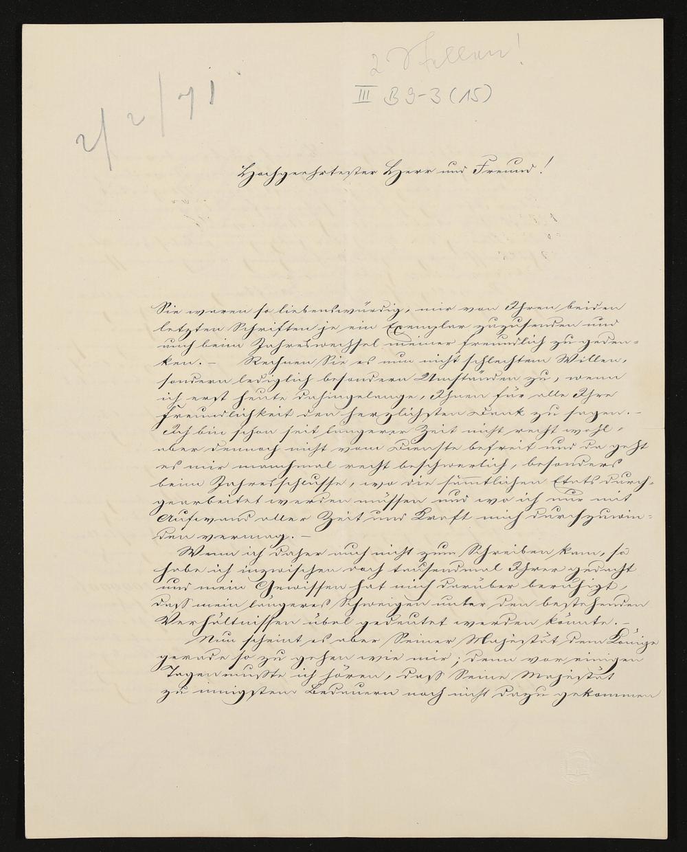 eigenhändiger Brief von Lorenz von Düfflipp (Königlich Bayerisches Hofsekretariat) an Richard Wagner