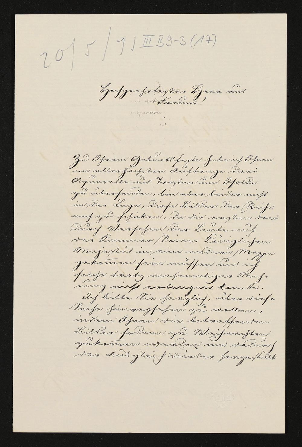 eigenhändiger Brief von Lorenz von Düfflipp (Königlich Bayerisches Hofsekretariat) an Richard Wagner