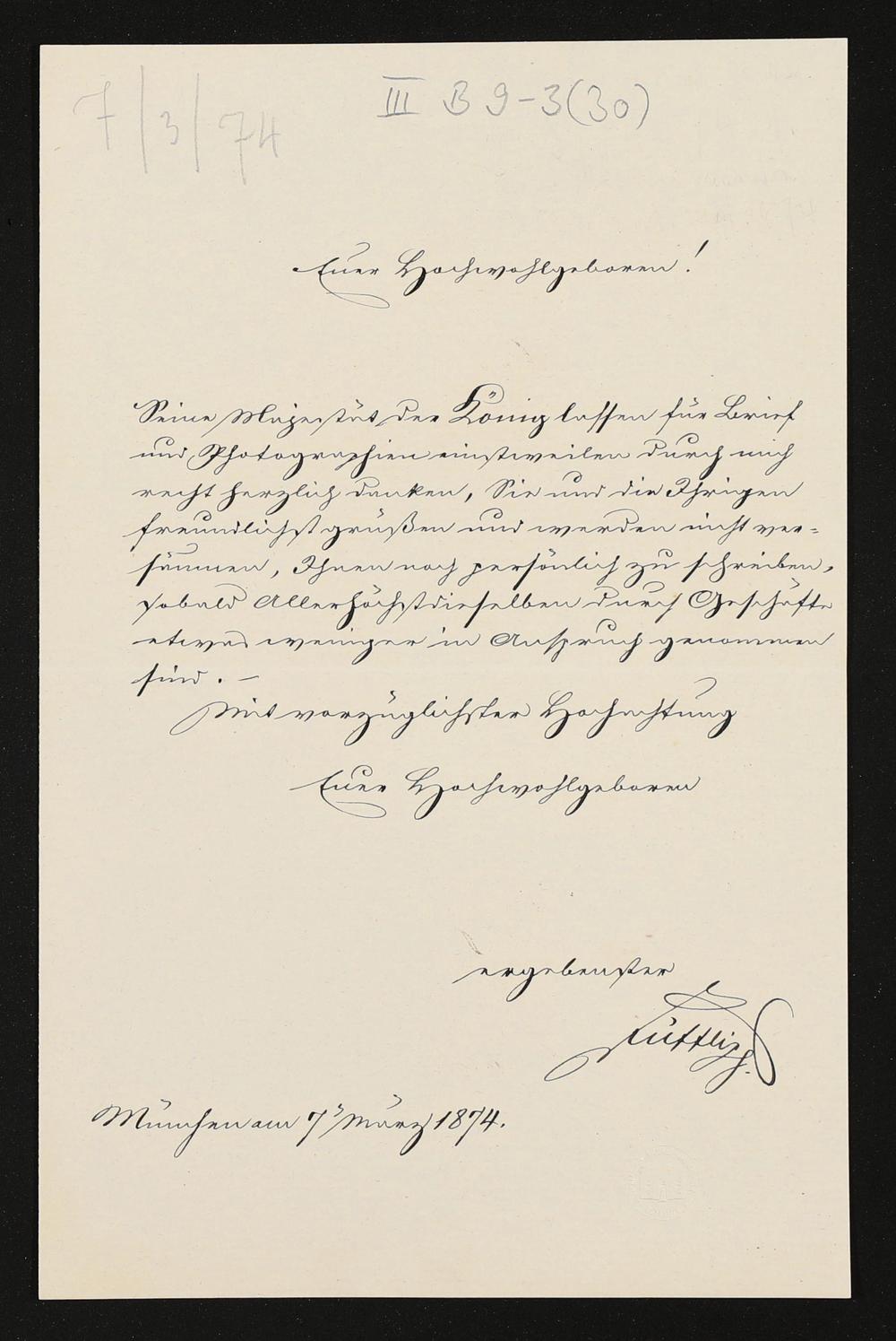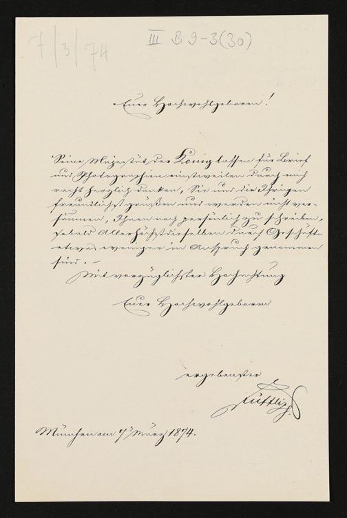 eigenhändiger Brief von Lorenz von Düfflipp (Königlich Bayerisches Hofsekretariat) an Richard Wagner