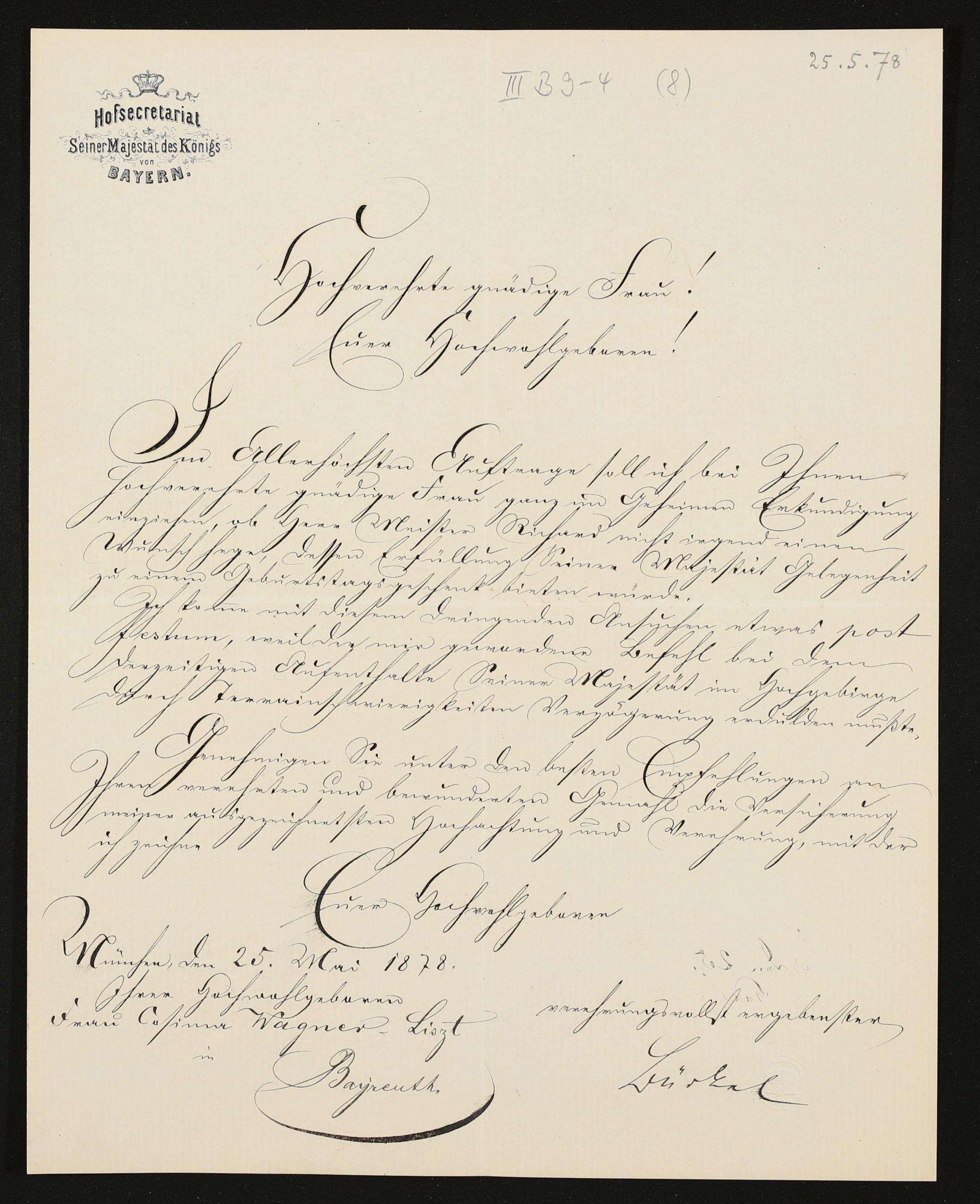 eigenhändiger Brief von Ludwig von Bürkel (Königlich Bayerisches Hofsekretariat) an Cosima Wagner