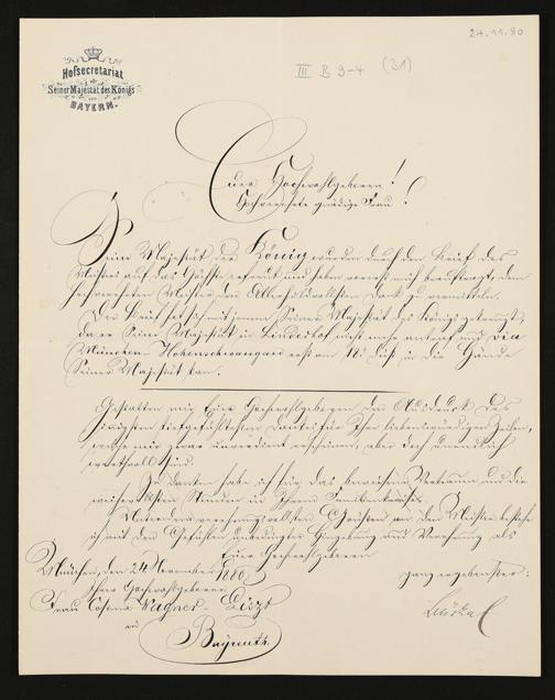 eigenhändiger Brief von Ludwig von Bürkel (Königlich Bayerisches Hofsekretariat) an Cosima Wagner