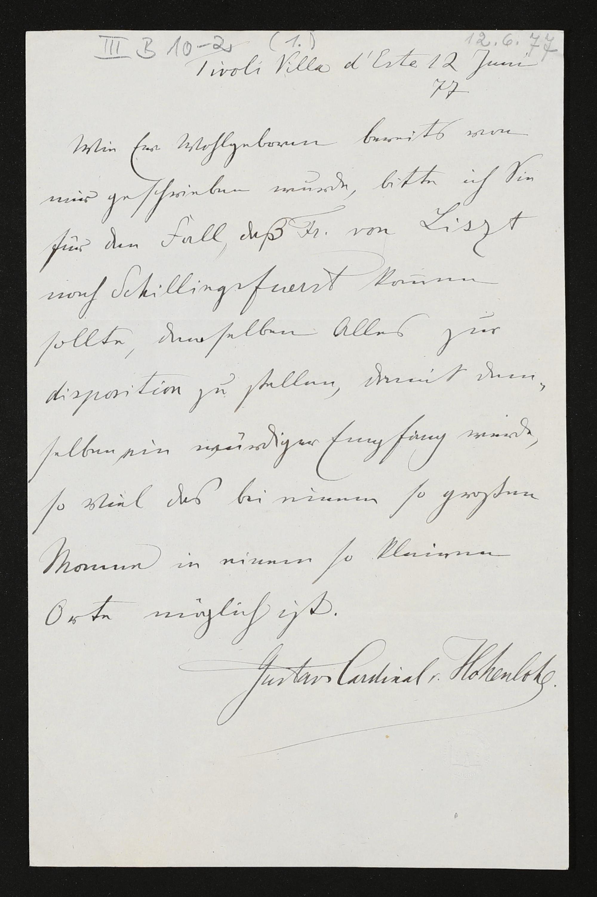 eigenhändiger Brief von Gustav zu Hohenlohe-Schillingsfürst an den Verwalter Anton Herr