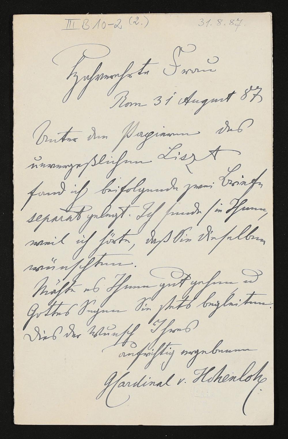 eigenhändiger Brief von Kardinal Gustav zu Hohenlohe-Schillingsfürst an Cosima Wagner