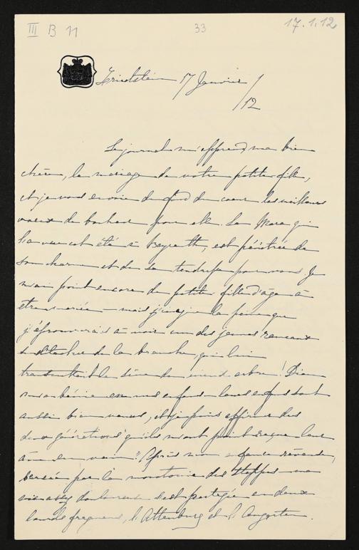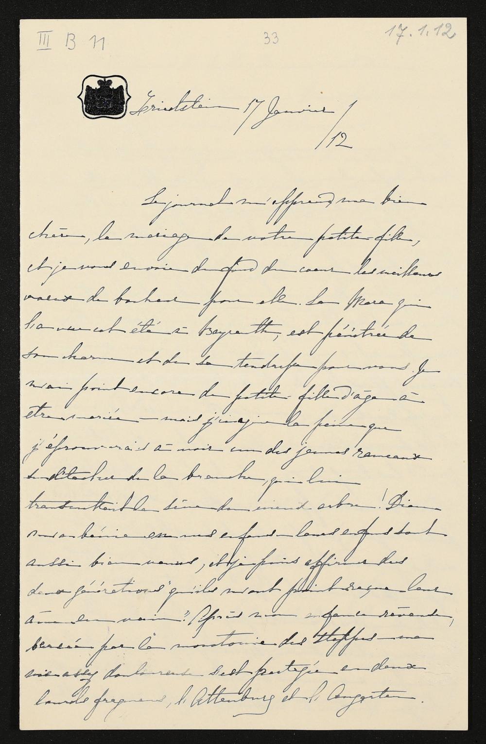 eigenhändiger Brief von Marie zu Hohenlohe-Schillingsfürst an Cosima Wagner
