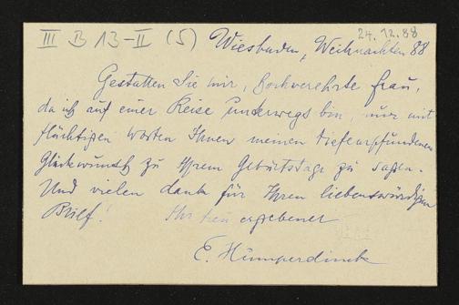 eigenhändige Briefkarte von Engelbert Humperdinck an Cosima Wagner