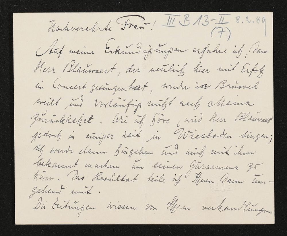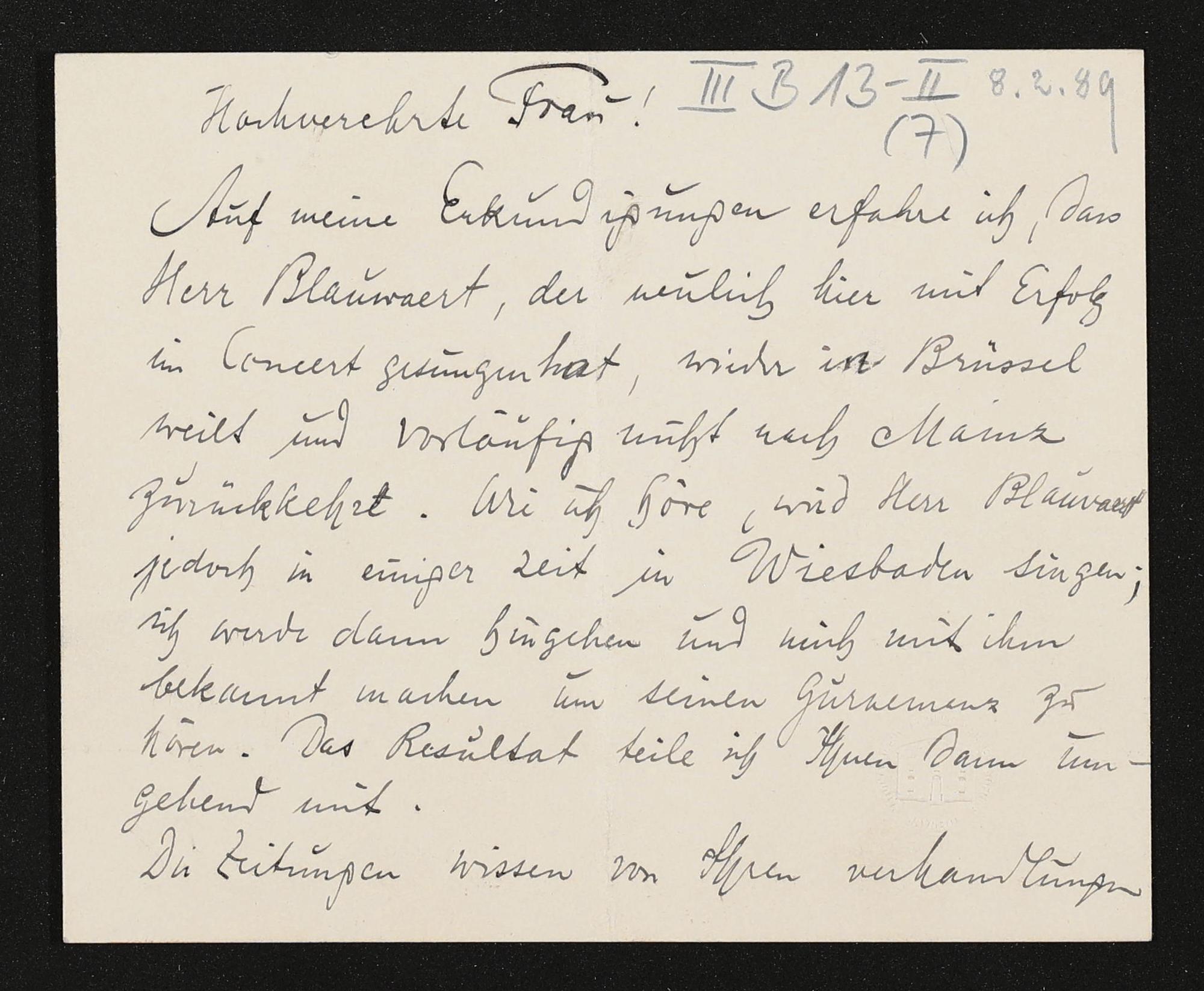 eigenhändige Briefkarte von Engelbert Humperdinck an Cosima Wagner