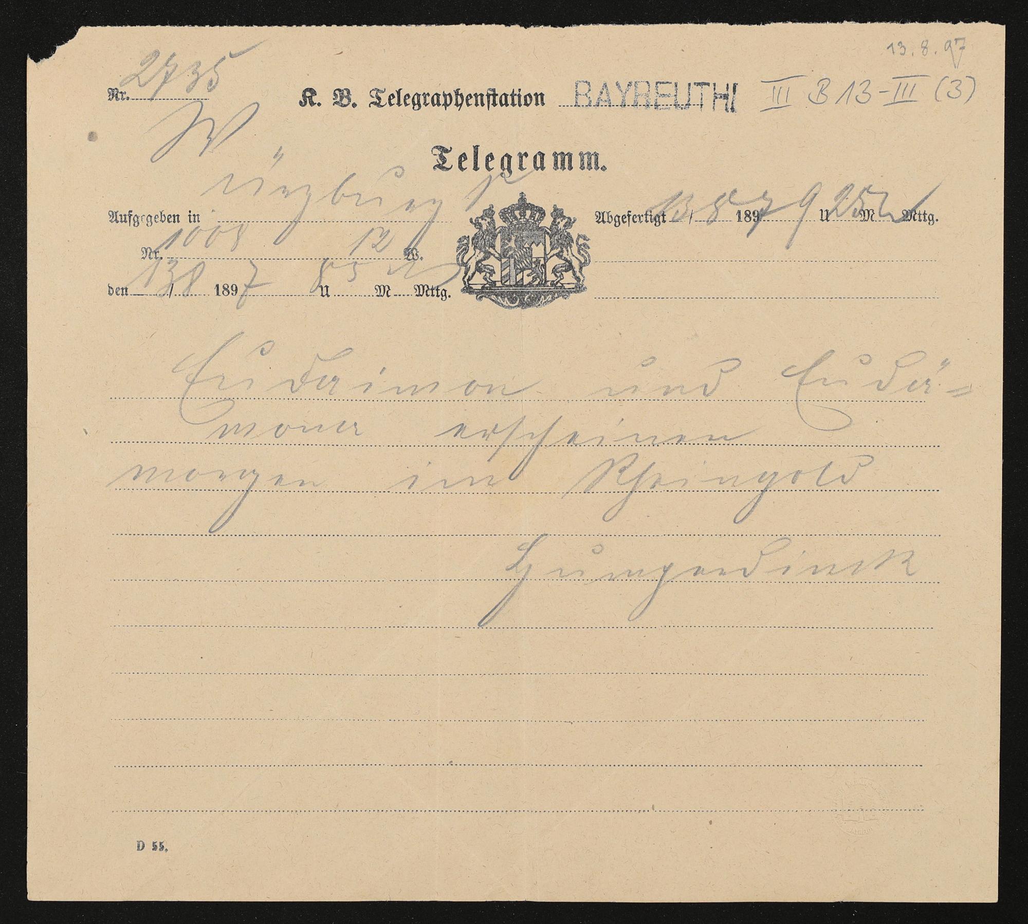 Telegramm von Engelbert Humperdinck an Cosima Wagner
