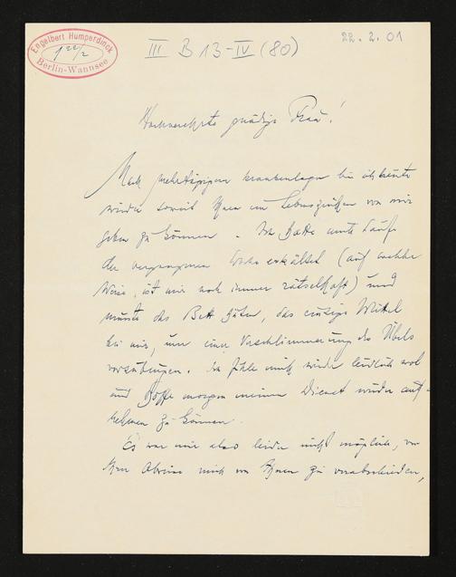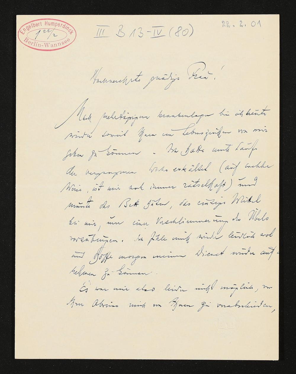 eigenhändiger Brief von Engelbert Humperdinck an Cosima Wagner