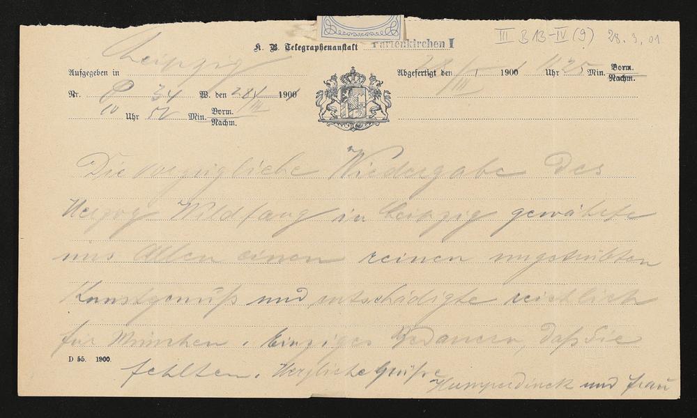 Telegramm von Engelbert Humperdinck an Cosima Wagner