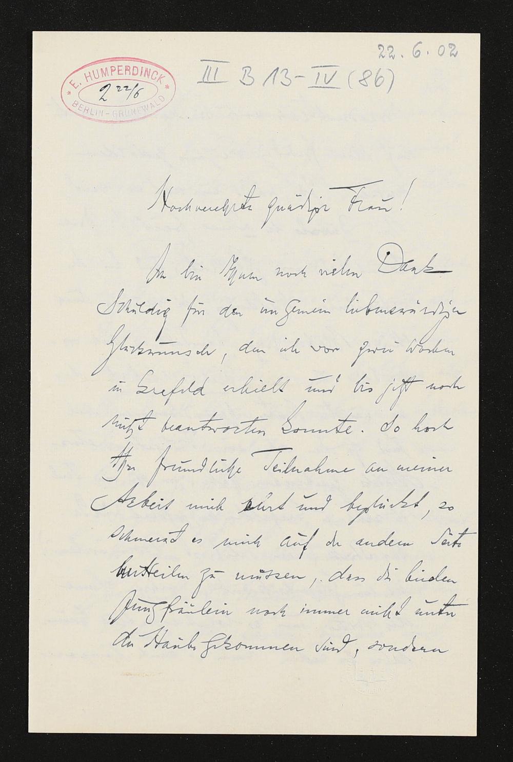 eigenhändiger Brief von Engelbert Humperdinck an Cosima Wagner