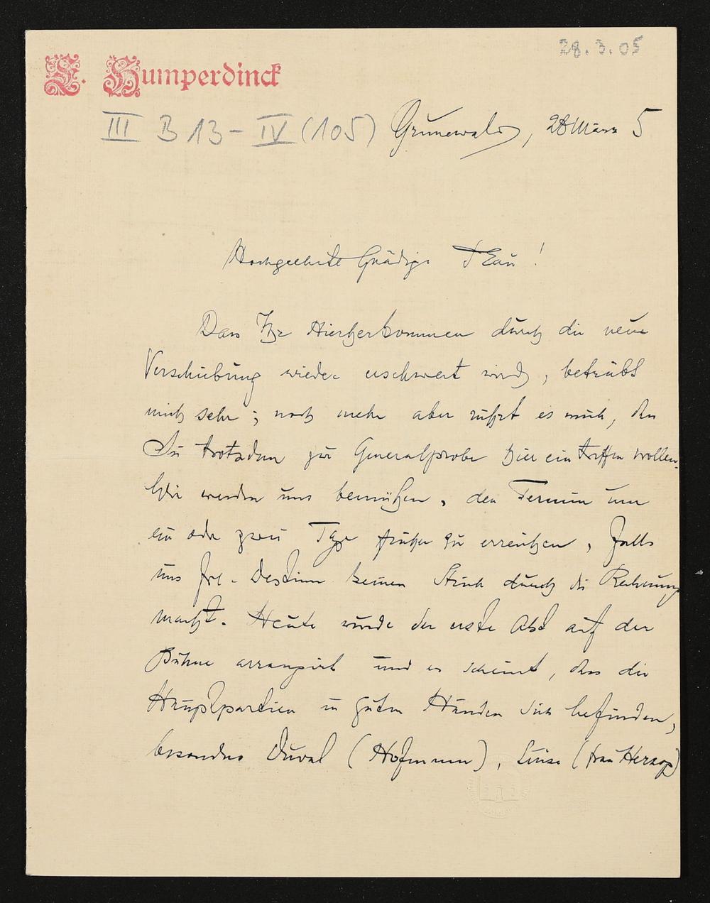eigenhändiger Brief von Engelbert Humperdinck an Cosima Wagner