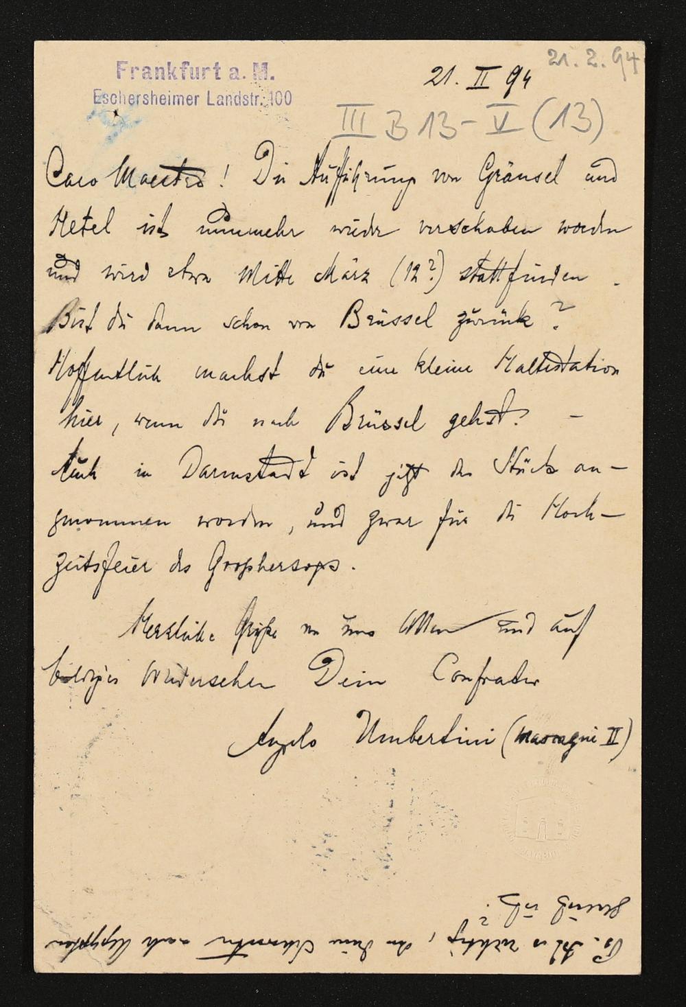 eigenhändige Postkarte von Engelbert Humperdinck an Siegfried Wagner