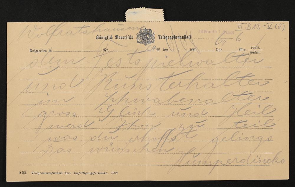 Telegramm von Engelbert Humperdinck an Siegfried Wagner
