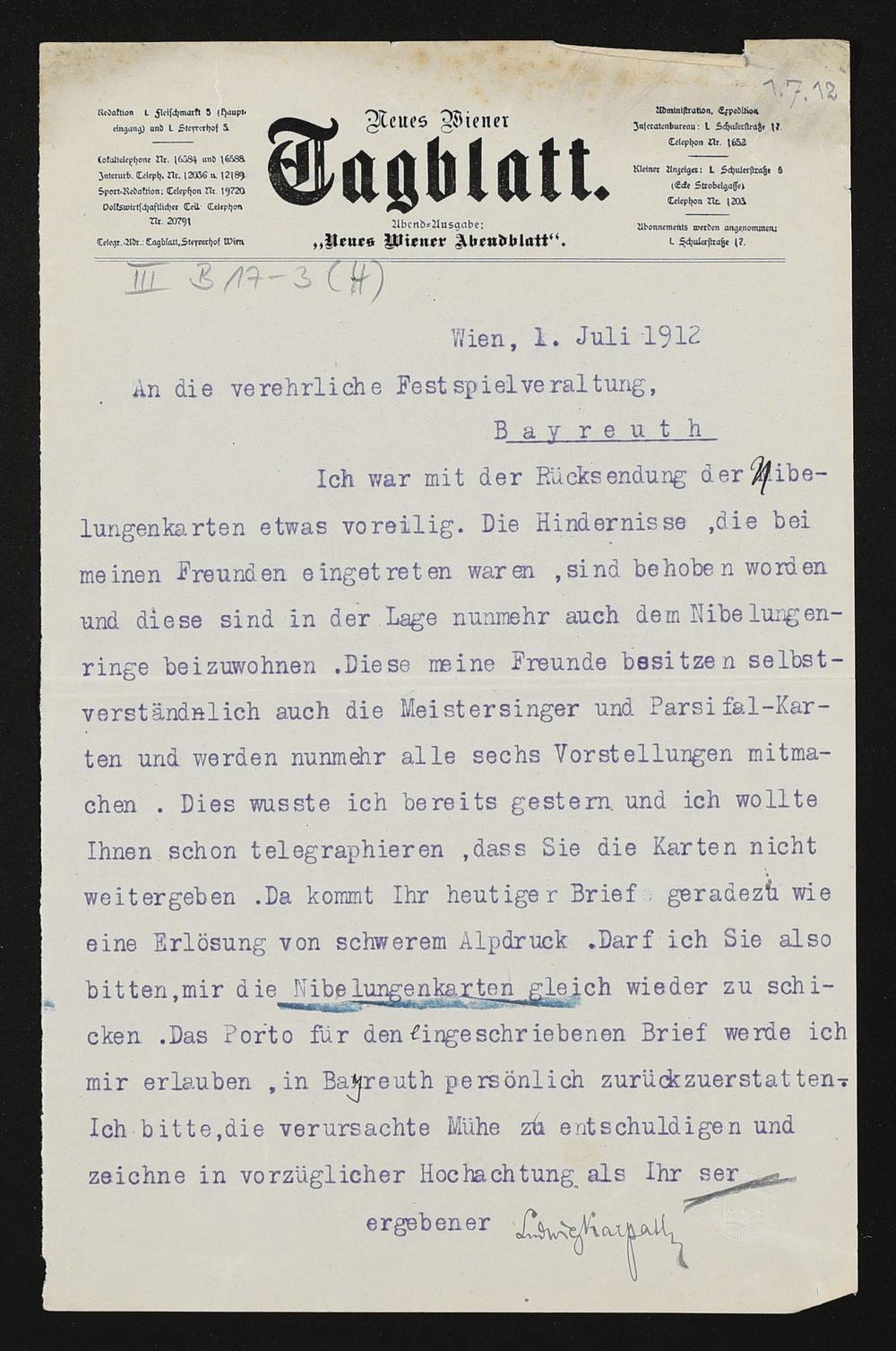 eigenhändiger Brief von Ludwig Karpath an die Festspielverwaltung Bayreuth