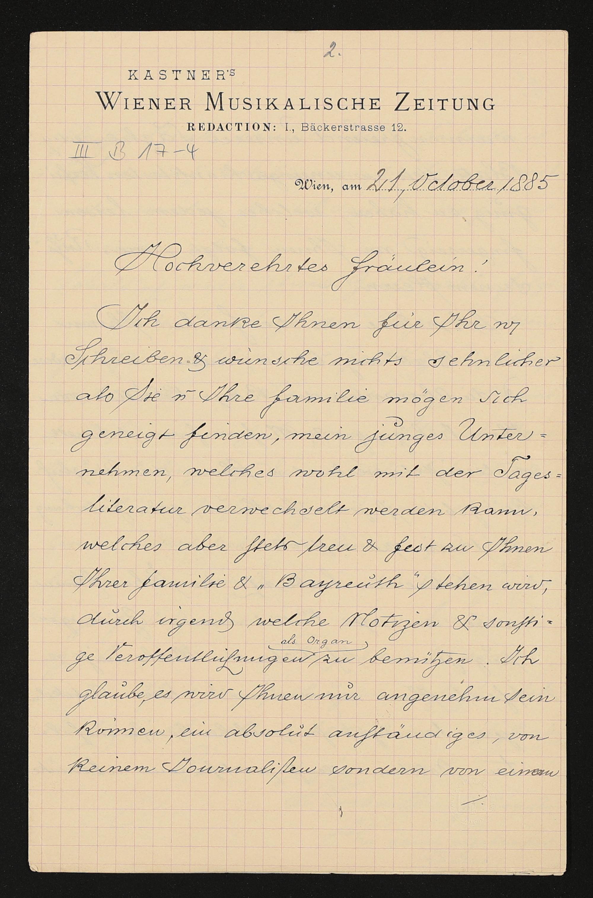 eigenhändiger Brief von Emerich Kastner (Wiener musikalische Zeitung) an eine unbekannte Empfängerin, mutmaßlich an Eva Wagner oder Daniela von Bülow