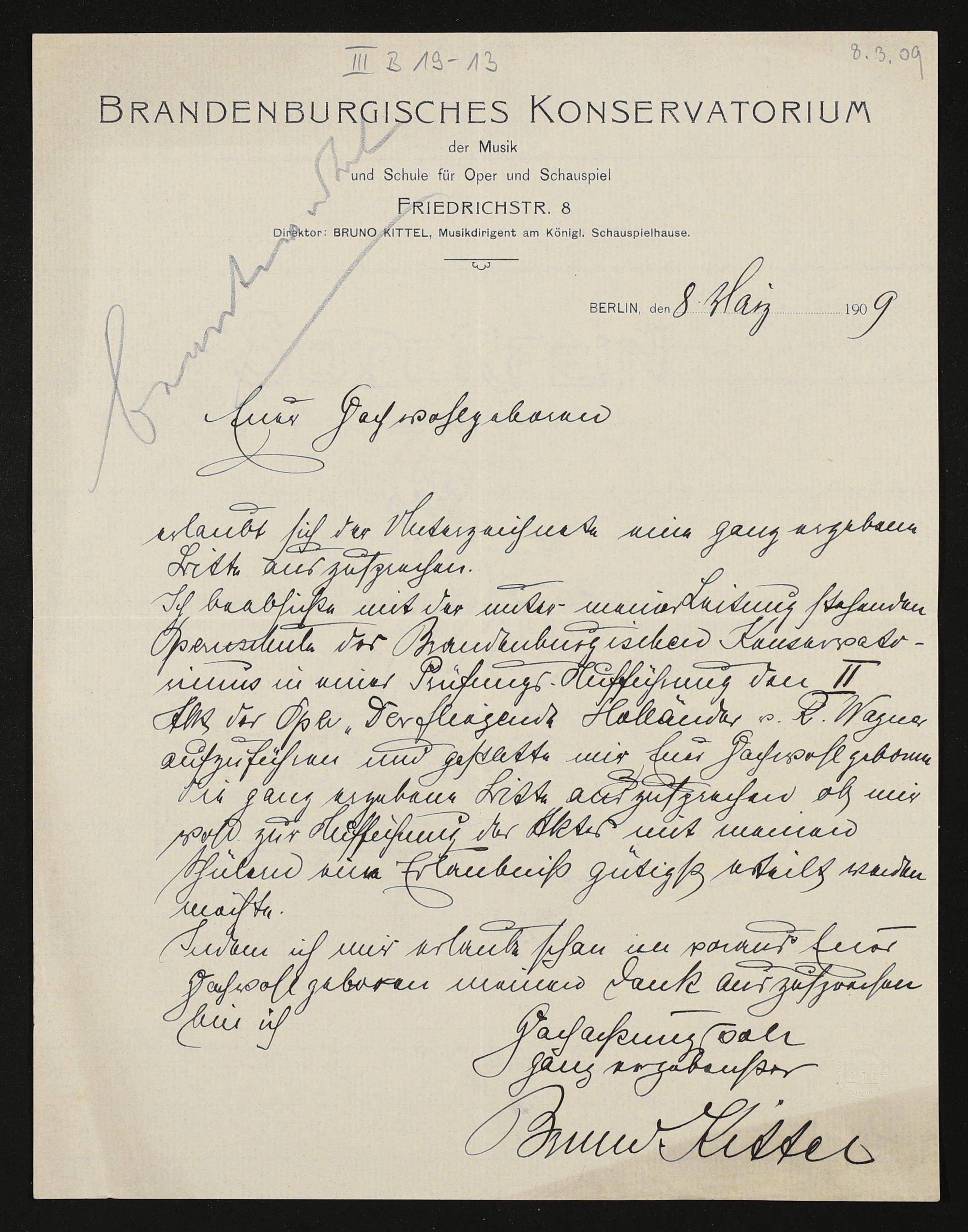 eigenhändiger Brief von Bruno Kittel (Brandenburgisches Konservatorium der Musik, Schule für Oper und Schauspiel) an einen unbekannnten Empfänger
