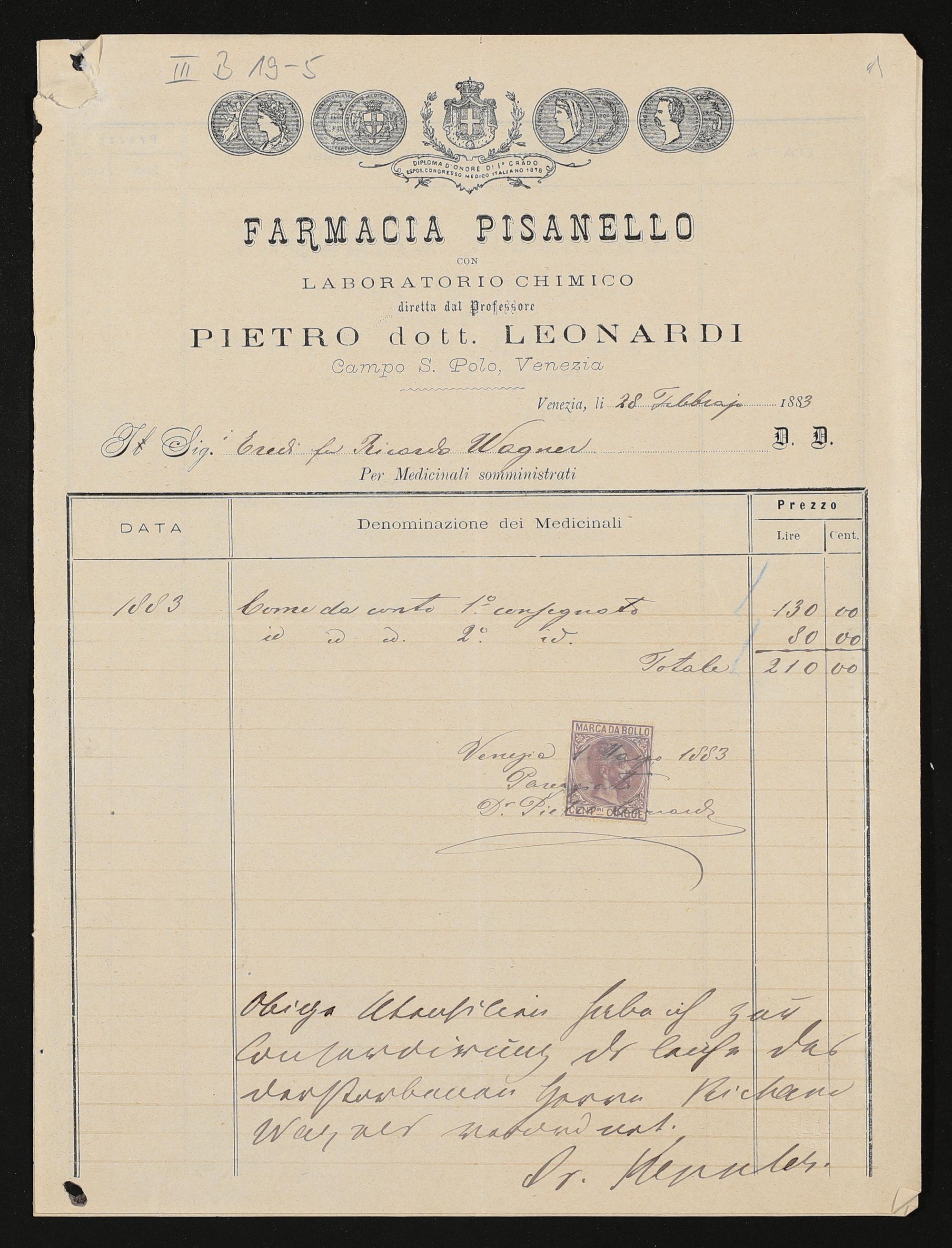 eigenhändige Rechnungsaufstellung von Pietro Leonardi an Dr. Friedrich Keppler, mit eigenhändigen Zeilen von Dr. Friedrich Keppler über Verwendung zur Konservierung der Leiche von Richard Wagner