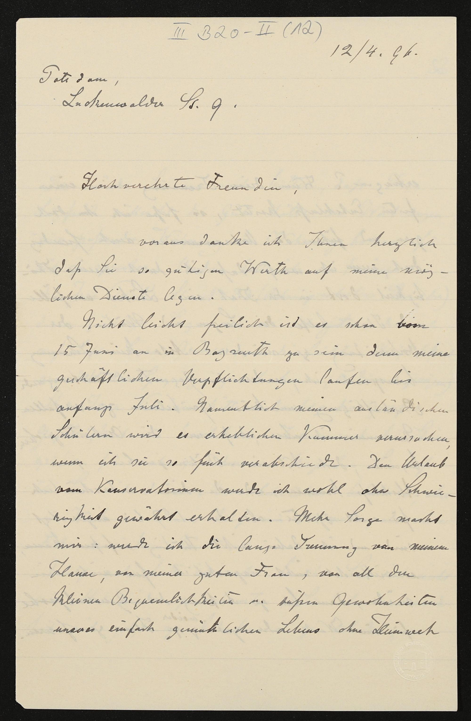 eigenhändiger Brief von Karl Klindworth an Cosima Wagner