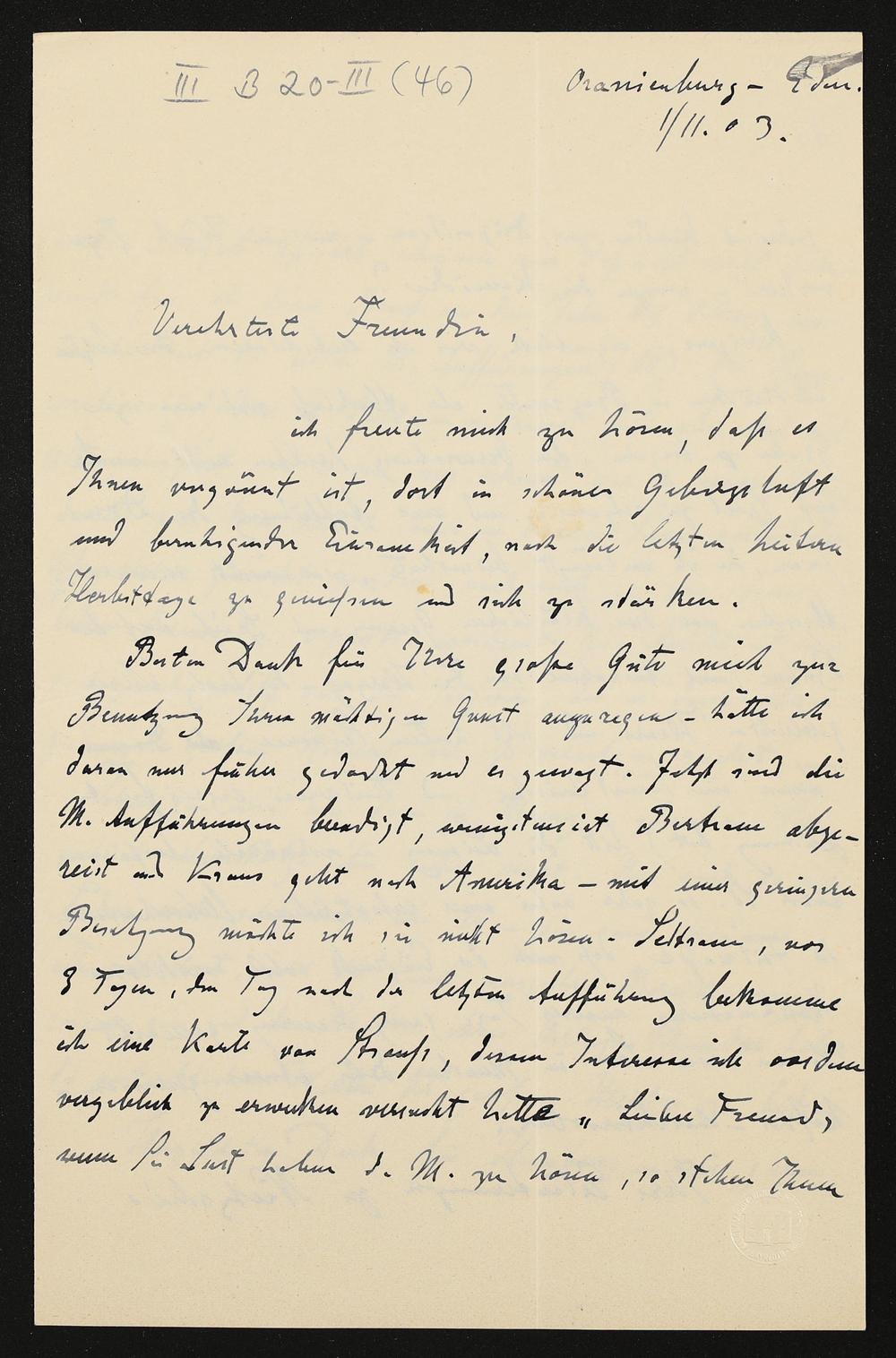 eigenhändiger Brief von Karl Klindworth an Cosima Wagner