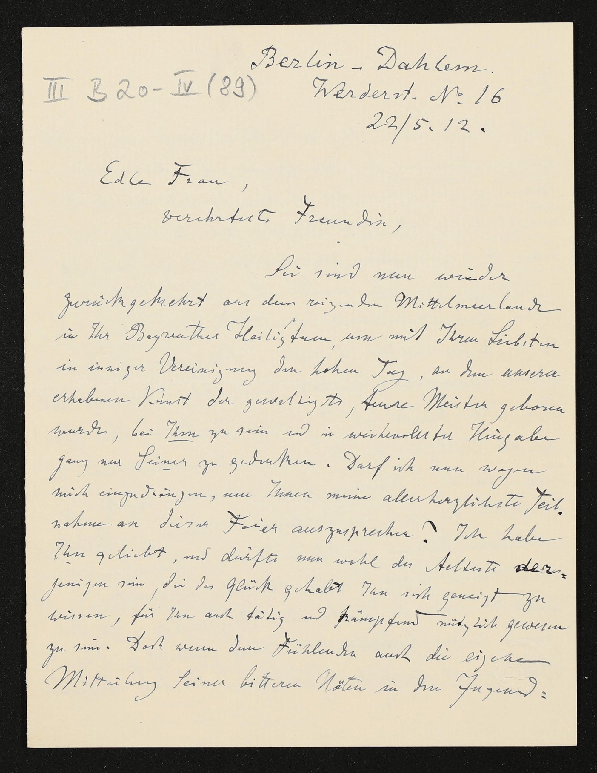 eigenhändiger Brief von Karl Klindworth an Cosima Wagner